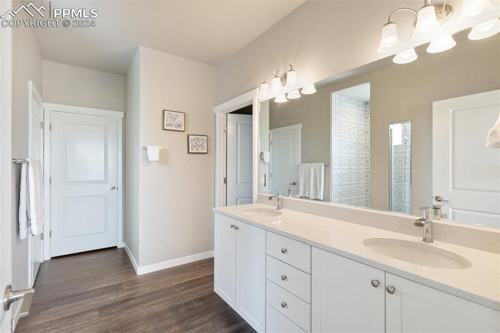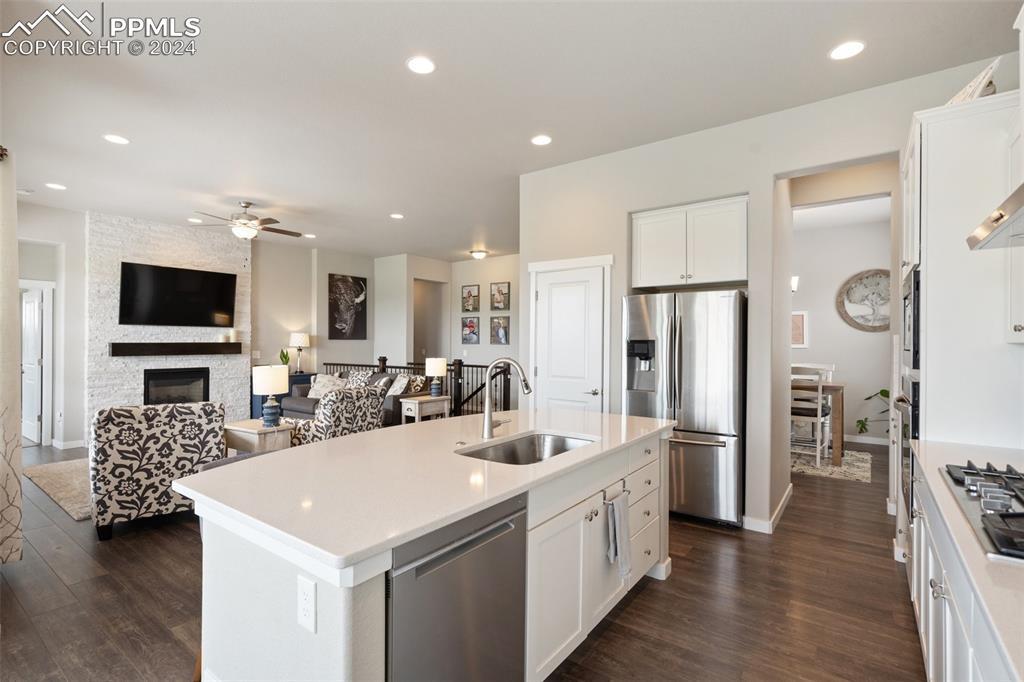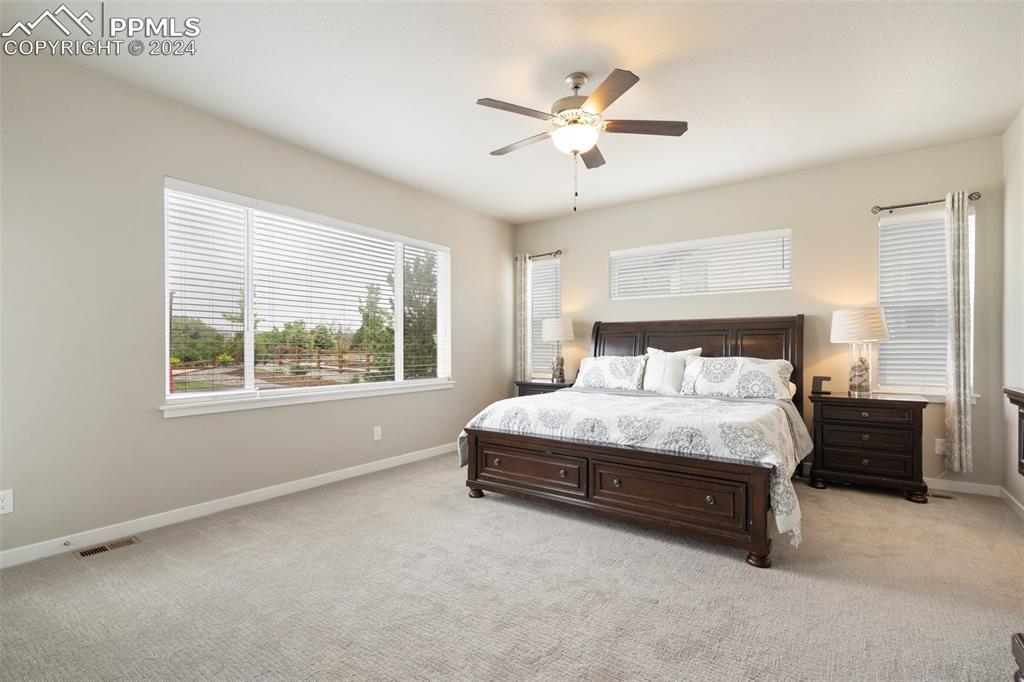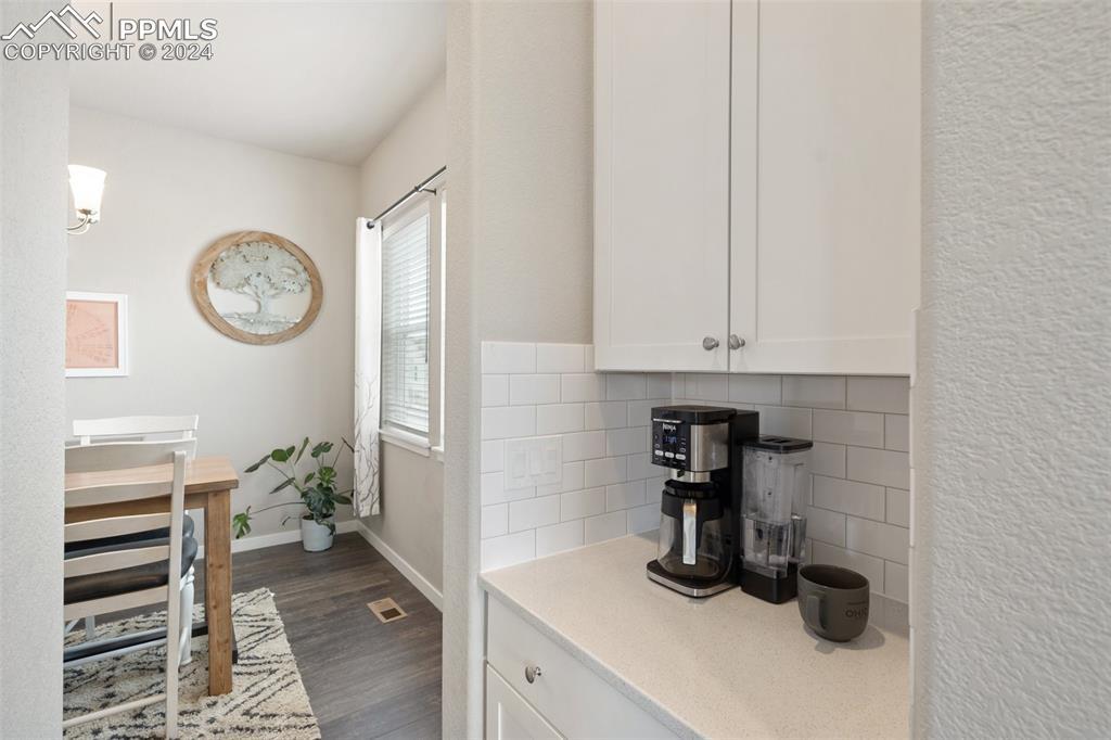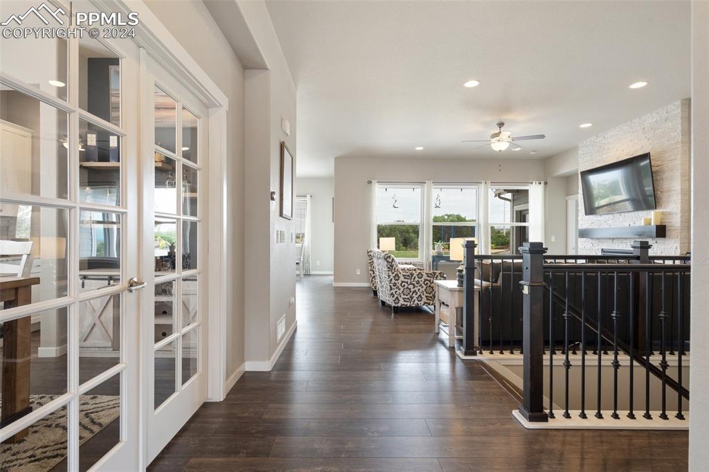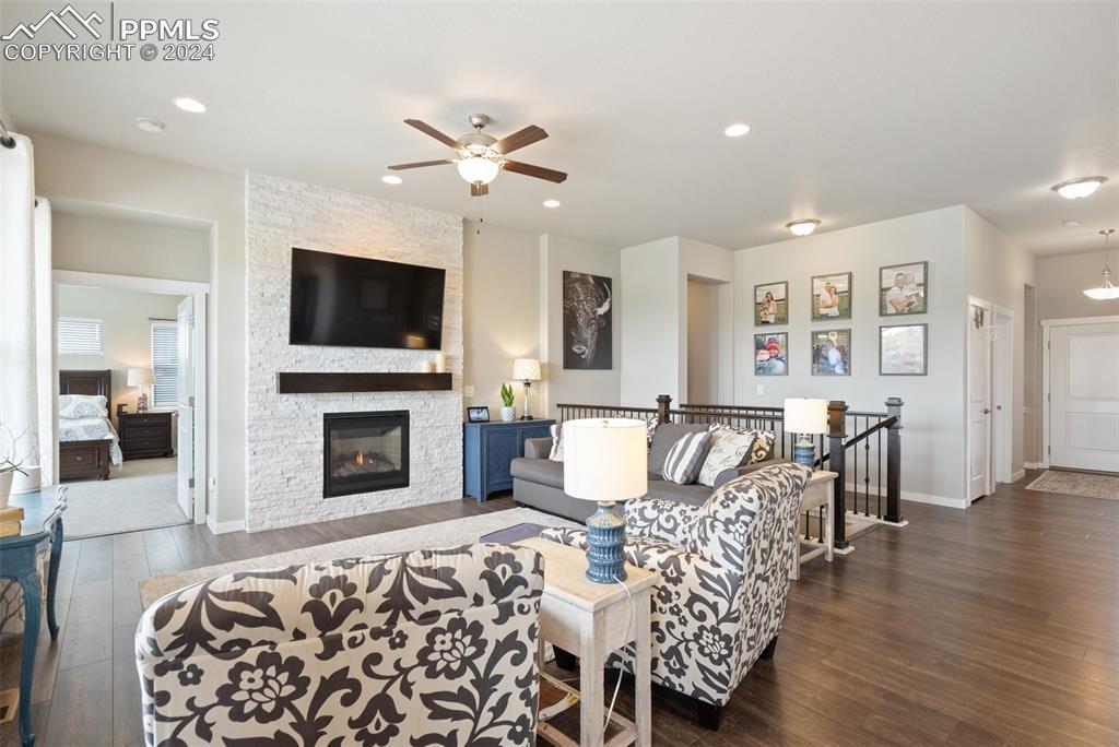 Beautifully maintained "Paradise" ranch-style home with fantastic mountain views, backing to open space. Close to the USAFA and all the newest shops and restaurants the northside has to offer. The main level has beautiful luxury wood laminate plank flooring and stacked ledgestone fireplace. Enjoy the gourmet kitchen with gas cooktop, stainless steel appliances, coffee bar, dining area and much more. Enjoy having a main level office or formal dining room. The expanded main level gives you 3 spacious bedrooms on the main floor with high end carpet. The main level primary retreat features a luxury en-suite bath with expanded spa style shower. Primary has access to the laundry room, and the owner's entrance. The lower level offers a huge family room perfect for entertaining and is plumbed for a wet bar, and 2 additional bedrooms, full bath, and an unfinished room to use for storage or add a Jr suite. A spacious 3 car garage with 4ft extension. The fully fenced and landscaped backyard with wireless irrigation system. Large covered patio, and raised beds. Fantastic mountain views and a very open back yard! This home has so much to offer!
