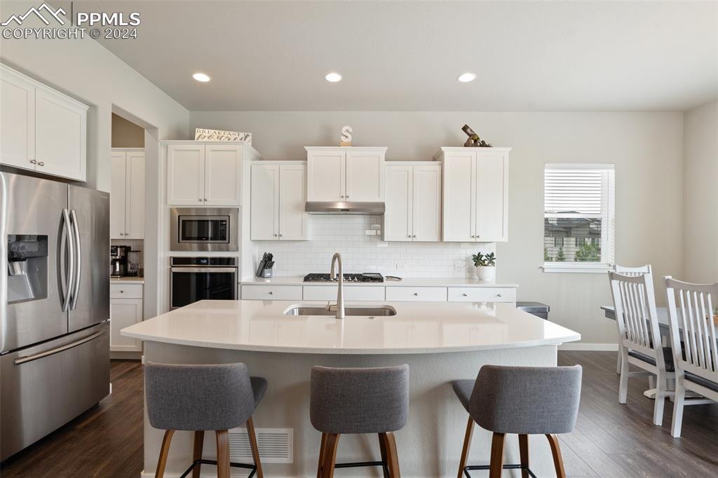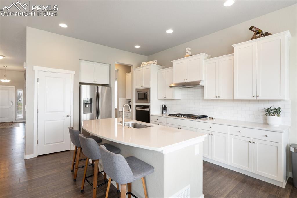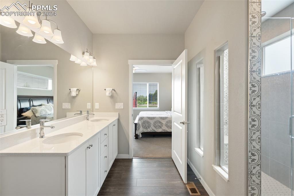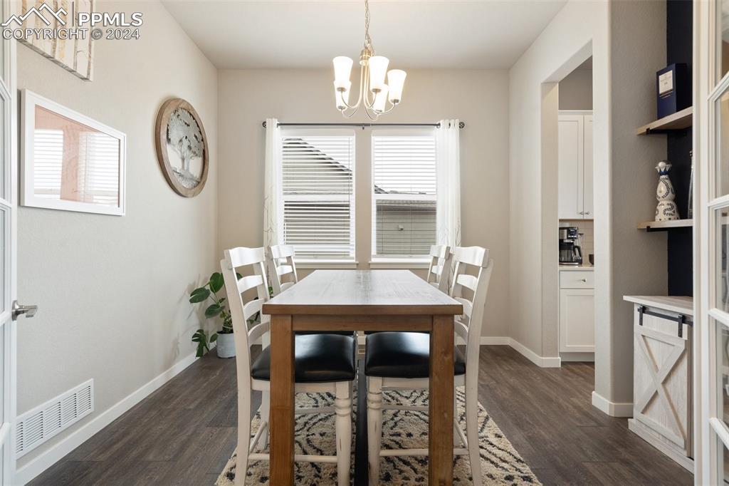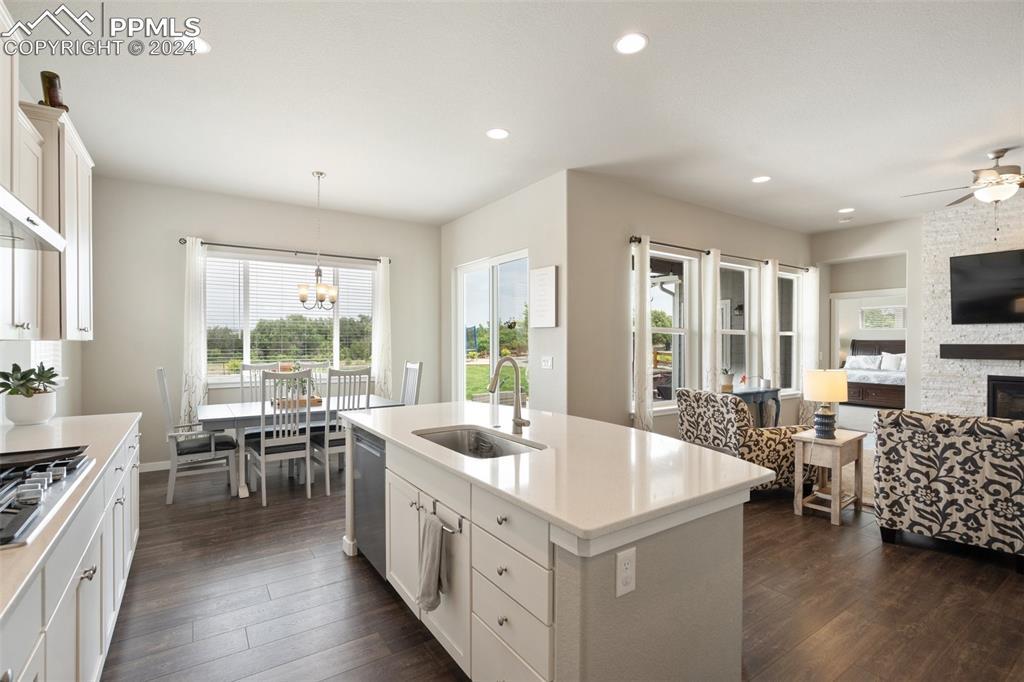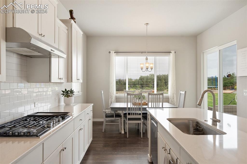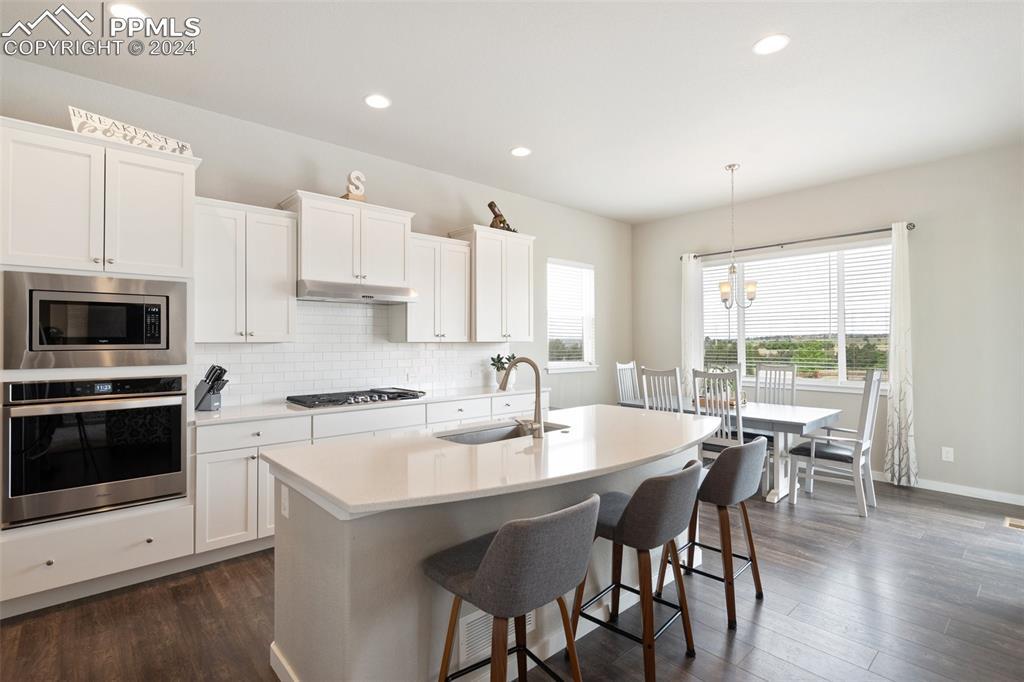 Beautifully maintained "Paradise" ranch-style home with fantastic mountain views, backing to open space. Close to the USAFA and all the newest shops and restaurants the northside has to offer. The main level has beautiful luxury wood laminate plank flooring and stacked ledgestone fireplace. Enjoy the gourmet kitchen with gas cooktop, stainless steel appliances, coffee bar, dining area and much more. Enjoy having a main level office or formal dining room. The expanded main level gives you 3 spacious bedrooms on the main floor with high end carpet. The main level primary retreat features a luxury en-suite bath with expanded spa style shower. Primary has access to the laundry room, and the owner's entrance. The lower level offers a huge family room perfect for entertaining and is plumbed for a wet bar, and 2 additional bedrooms, full bath, and an unfinished room to use for storage or add a Jr suite. A spacious 3 car garage with 4ft extension. The fully fenced and landscaped backyard with wireless irrigation system. Large covered patio, and raised beds. Fantastic mountain views and a very open back yard! This home has so much to offer!