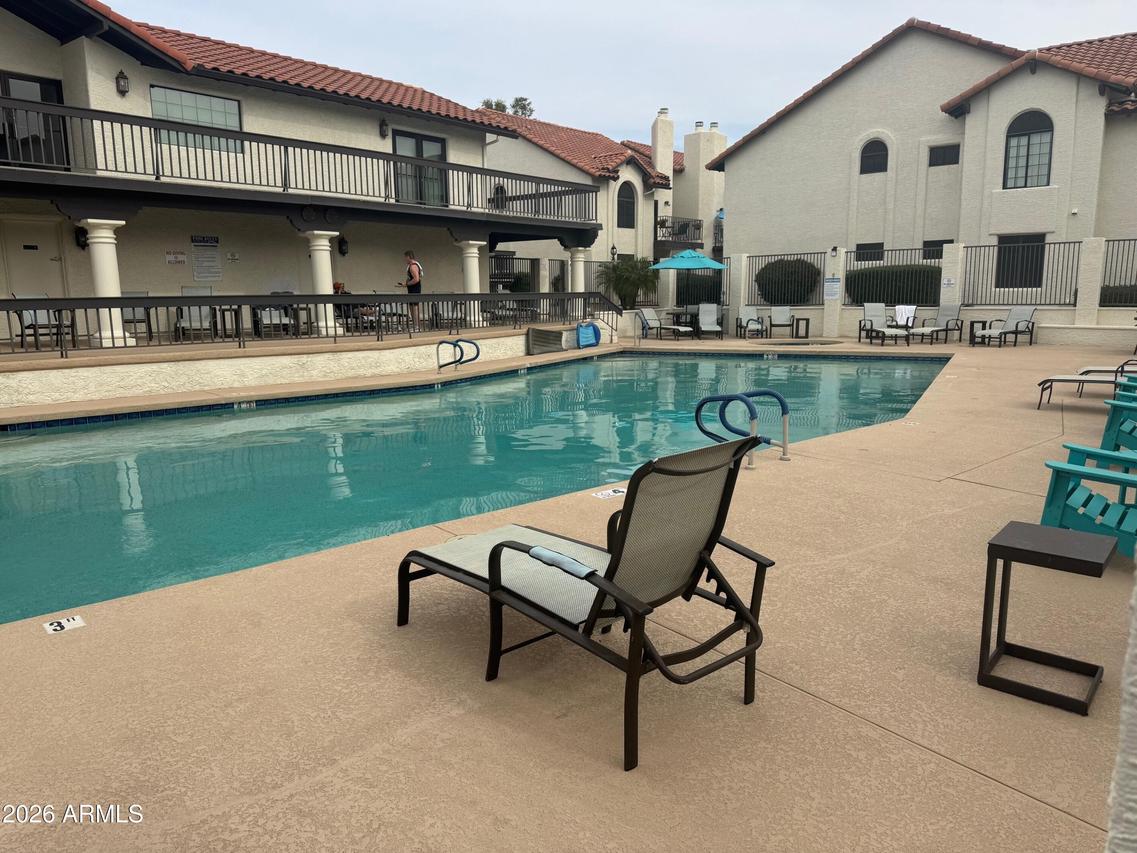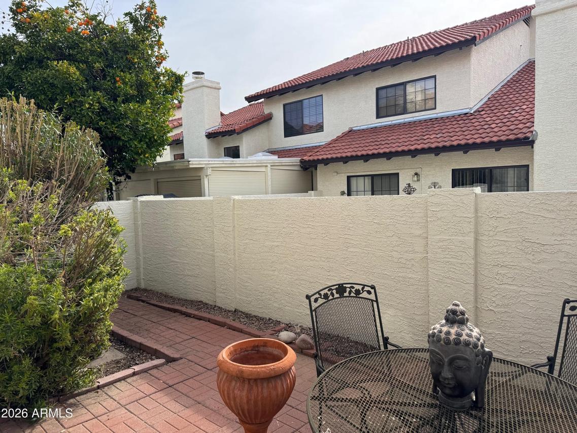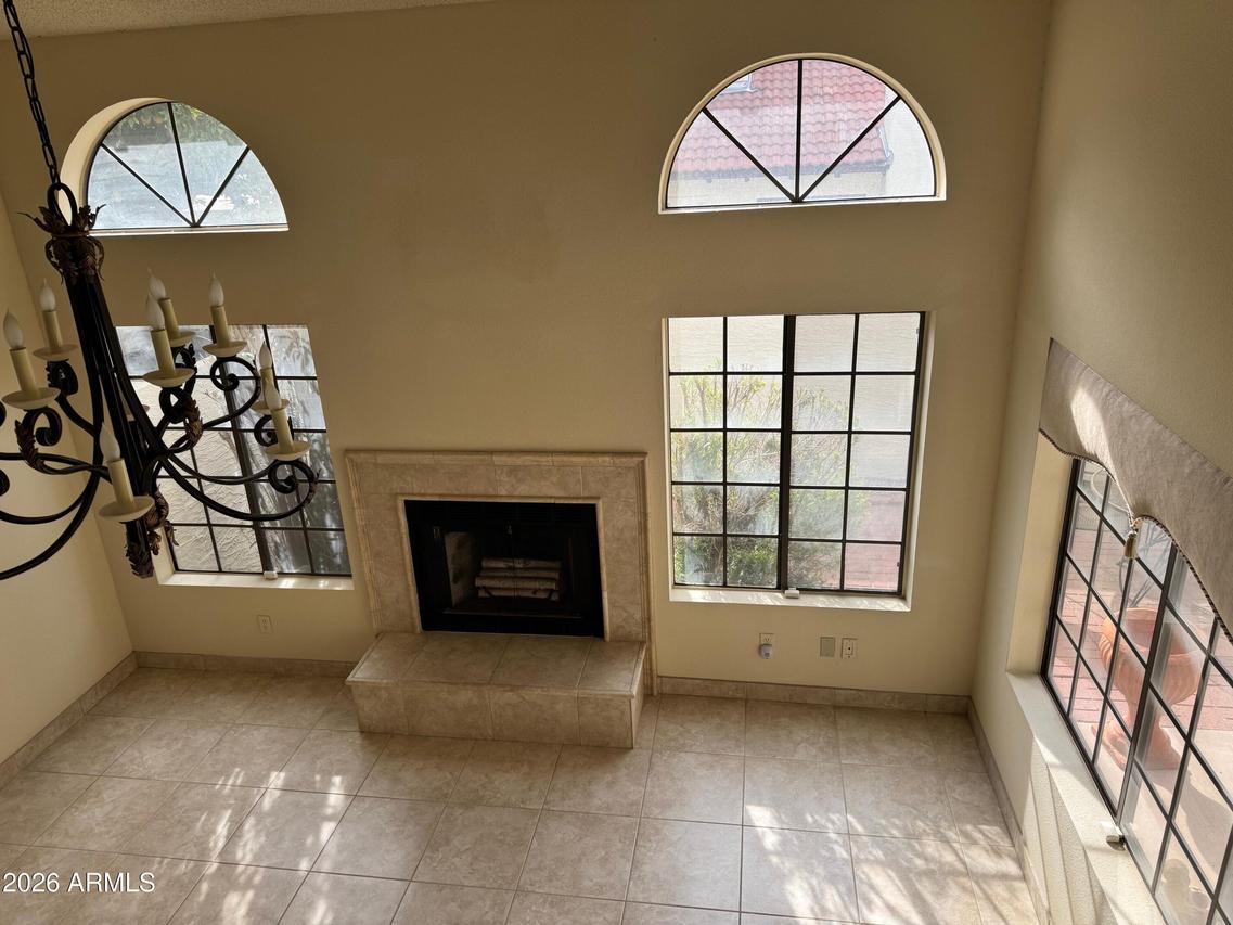 Beautiful La Contessa townhome ideally located in the heart of Scottsdale. This highly sought-after floorplan offers 2 bedrooms, 2 baths, and a versatile library loft bonus space. Soaring vaulted ceilings create a bright, open atmosphere throughout. The updated kitchen features white cabinetry, granite countertops, stainless steel appliances, and opens to a cheerful breakfast area with a designer light fixture. The open-concept living space includes a cozy wood-burning fireplace and access to a private covered patio. Neutral porcelain and travertine tile flow throughout, with new carpet on the stairs. Enjoy a 2-car garage with ample extra storage. Community amenities include a heated pool and spa, clubhouse, and workout facility.