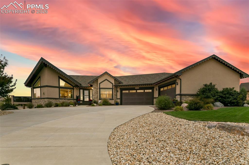 This custom home, featured in the 2013 HBA Parade of Homes, sits on an expansive lot of over an acre and offers sweeping mountain views from the great room and deck. Designed for both everyday comfort and entertaining, the open floor plan is filled with natural light and showcases hardwood floors, custom finishes, vaulted ceilings, and a gas fireplace. The gourmet kitchen is equipped with granite countertops, stainless steel appliances, a large island, soft-close cabinetry with roll-out pantry shelving, and abundant storage. The main level includes a spacious primary suite with a five-piece bath and walk-in closet, two additional bedrooms, a full bath, and a well-appointed laundry/mudroom with built-ins and a convenient drop zone. The finished walk-out basement features 9-foot ceilings, a wet bar, and a pre-wired media room. Two additional bedrooms are located on this level, including a second primary-style suite with a walk-in closet and private bath, making the home ideal for multigenerational living or guests. The oversized garage offers hot and cold water, built-in storage, and space for up to five vehicles or a combination of cars and workshop. Outdoors, enjoy a private backyard backing to open space and trails, complete with a covered deck, custom patio, basketball court, sprinkler system, storage shed, and permanent exterior holiday lighting. With room to breathe and space to gather, this property delivers exceptional indoor and outdoor living.