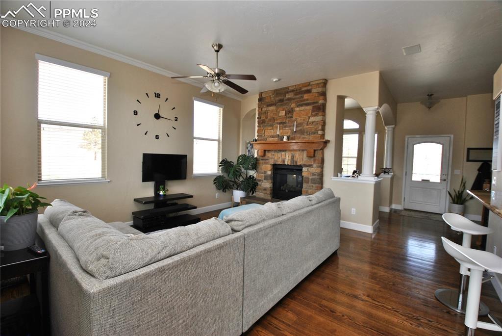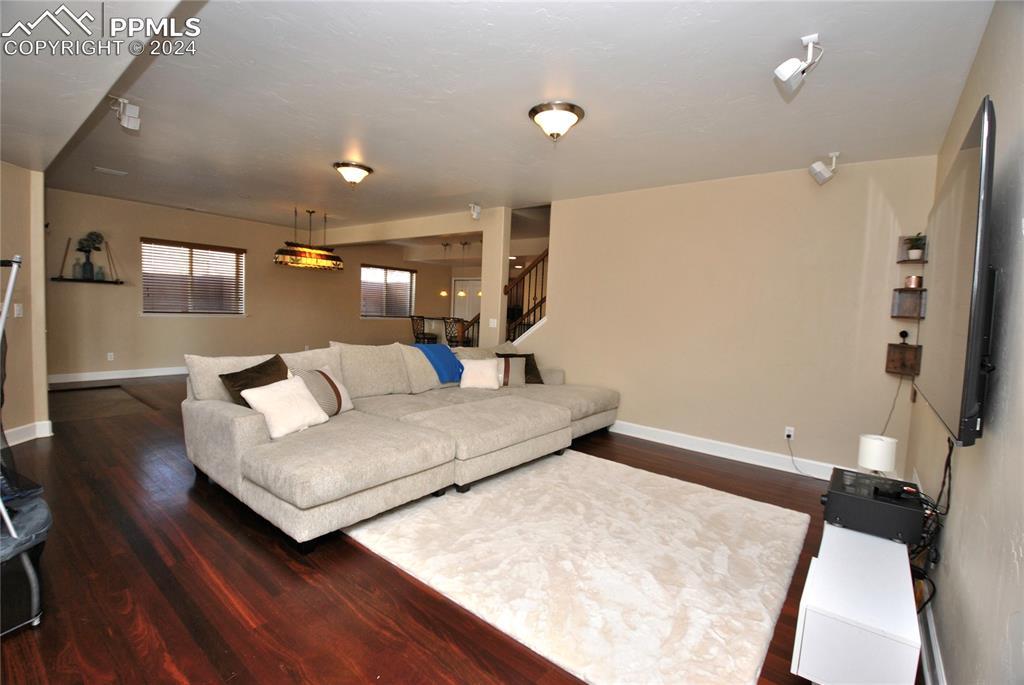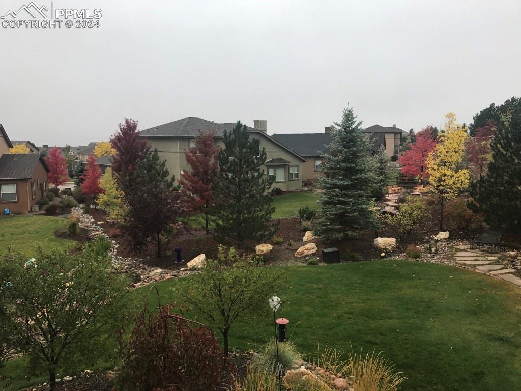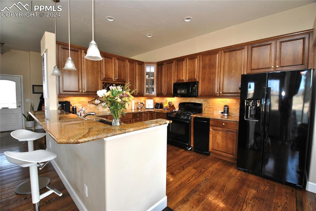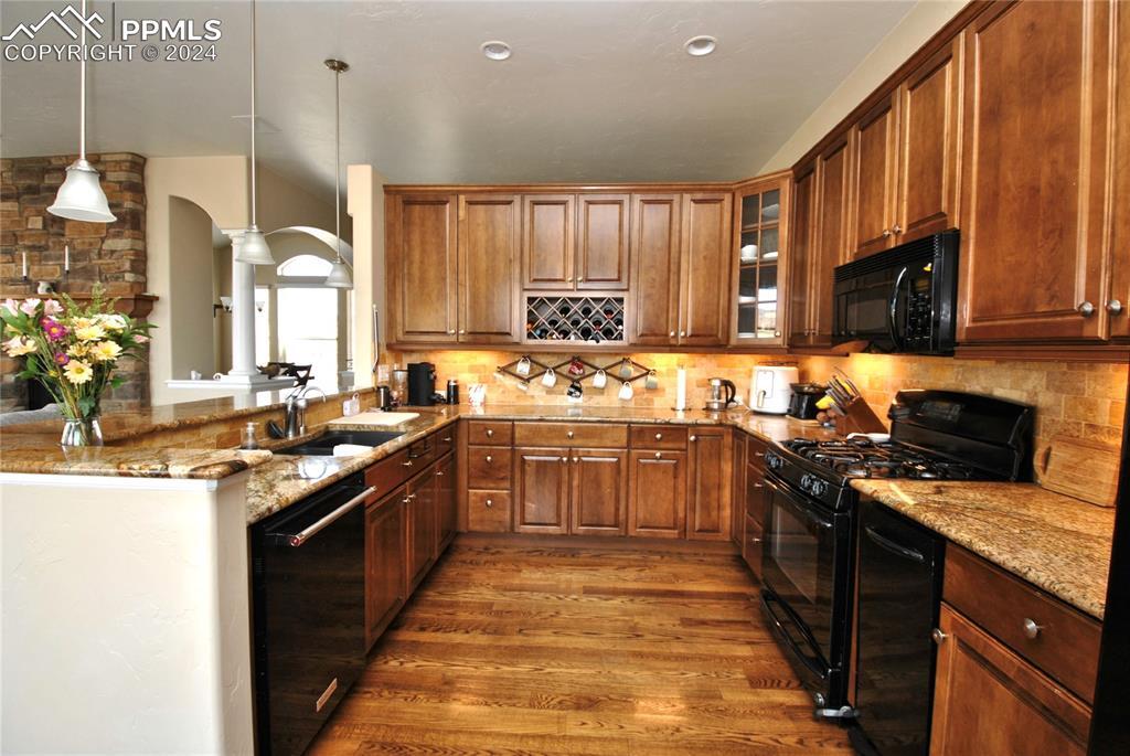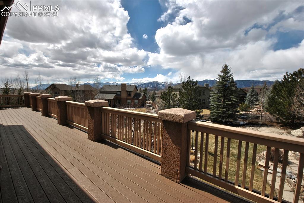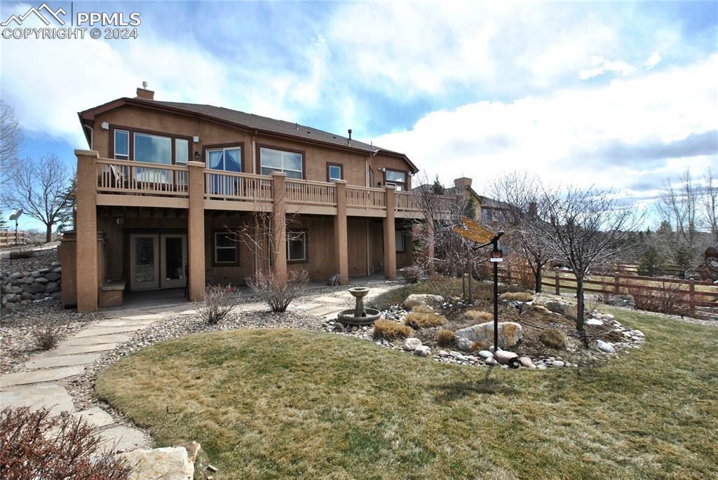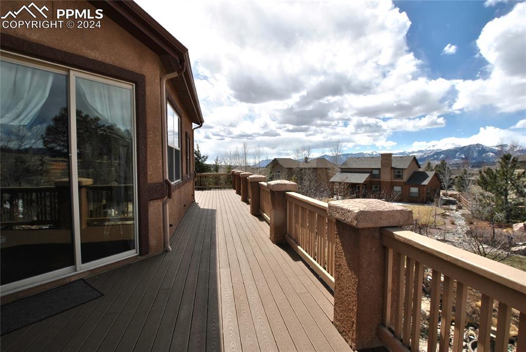 BEAUTIFUL FLYING HORSE!! Classic Homes "Cuchara" model rancher with Spectacular Pikes Peak & Front Range Views. Enjoy the full length trex deck and sound system or the walkout patio to enjoy the views and the Gorgeous designer landscaping. Hardwood floors throughout most of the main level flows into this spacious living home with big eat in kitchen with granite countertops, appliances and hickory cabinets that overlook the living area accented by gas stone fireplace that flows into dining area. Huge master suite featuring luxury 5 piece bath and huge closet plus bonus bedroom/study with French door entry. Fully finished walkout basement with Extended height ceiling, huge family and game rooms with Australian "Jarrah" wood floors and built in wet bar. Surround sound, 2 more huge bedroom's and 2 more tiled baths. This is loaded with more extras like Central A/C, Custom blinds, 2 tone paint package, stamped concrete patio and fireplace, prewired for hot tub, sprinkler system, steel garage shelving, all in District 20 Schools!!
