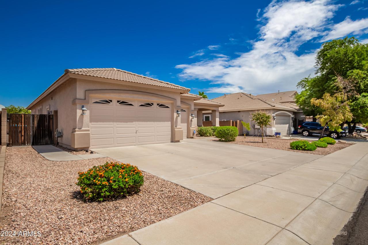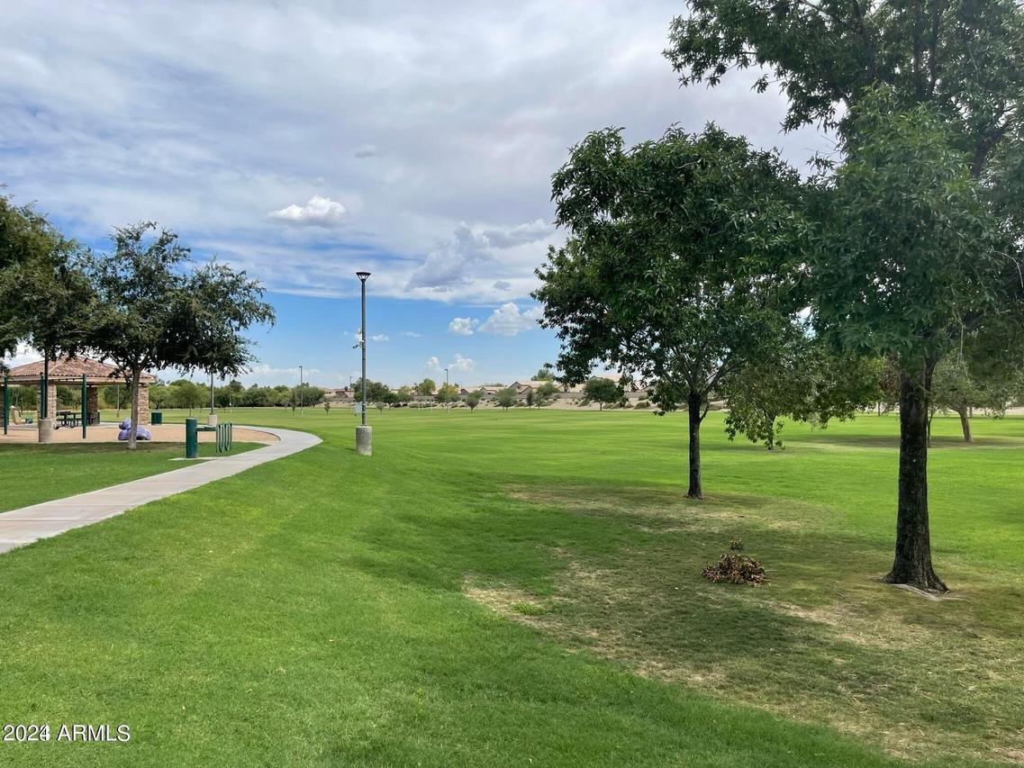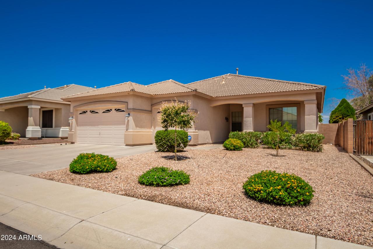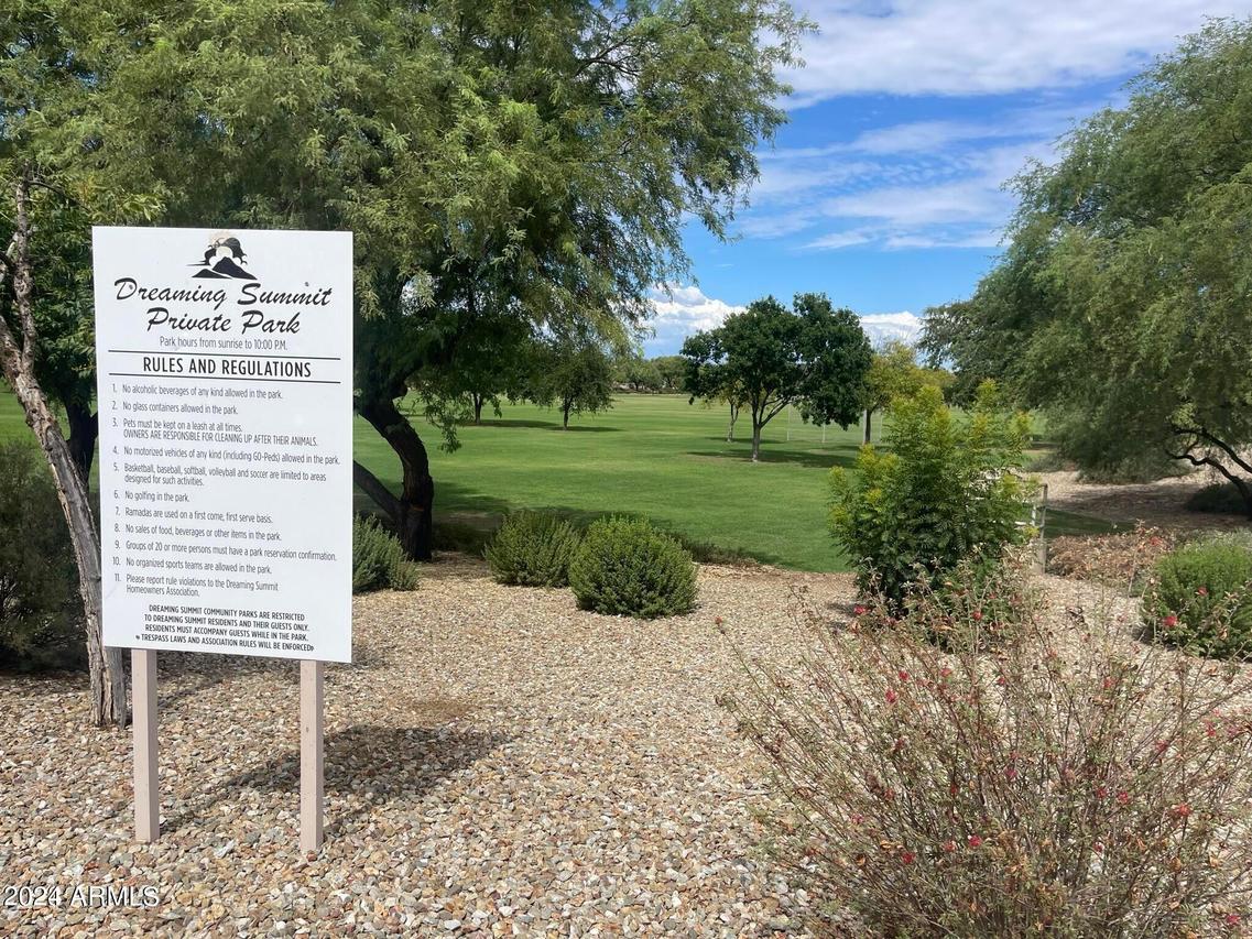 Honey Stop the Car! Showcasing Pride of Ownership, this updated property is a true gem * 4BR, 2BA, 3-car Garage * Desirable Dreaming Summit in Litchfield Park * North/South Exposure * Interior features 10ft ceilings throughout * At the entry, you'll find a formal living and dining area, complete with elegant wood shutters and gleaming laminate floors. The remodeled open kitchen to great room features gas cooking, stainless steel appliances, and abundant counter space with slab granite. All-white wood cabinets with added crown molding, soft-close hinges, and drawers add a touch of elegance. The bay window in the dining area, along with the pantry and oversized center island with a long-neck faucet and deep undermount sink, enhances the kitchen's design. Clerestory windows . . . allow natural light to fill the great room, further elevating the kitchen's appeal. The spacious Primary suite boasts a double-door entry, laminate floors, and a bay window. The walk-in closet is illuminated by small clerestory windows, allowing natural light without sacrificing wall space. The ensuite bathroom includes a walk-in shower, block windows above a separate garden tub, and a private toilet room with a frosted glass window for added light and privacy. The secondary bedrooms are equally spacious, each with laminate flooring, ceiling fans, and ample closet space. Outside, the backyard offers a serene retreat with an extended covered concrete patio, perfect for relaxation or entertaining. The grass yard, while currently dormant, adds to the charm and photos have been enhanced for appeal. There is a mature citrus tree and the elevated herb/vegetable bed allowing for easy gardening. The concrete walkway around the side of the property provides convenient access to the garage and double gate. The 3-car garage has painted floors and is thoughtfully equipped with built-in cabinets with work counter, a separate utility sink with upper and lower cabinets, and a water softener system. THIS 4-BEDROOM HOME IS EXCEPTIONAL AND IS NOT TO BE MISSED * SEE IT TODAY! CLOSE TO PARKS & SCHOOLS * GOLF * NEARBY SHOPPING, DINING & ENTERTAINMENT * GLENDALE SPORTS & ENTERTAINMENT DISTRICT * DESERT DIAMOND CASINO * WILDLIFE WORLD ZOO AQUARIUM & SAFARI PARK * STATE FARM STADIUM * TANGER OUTLETS *