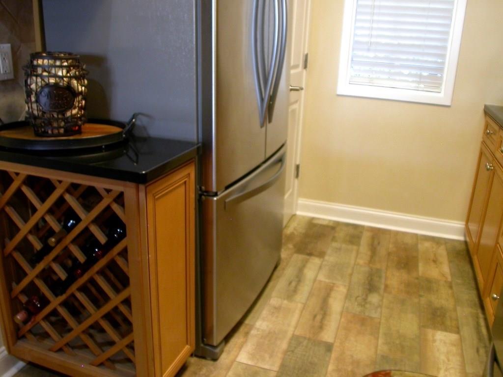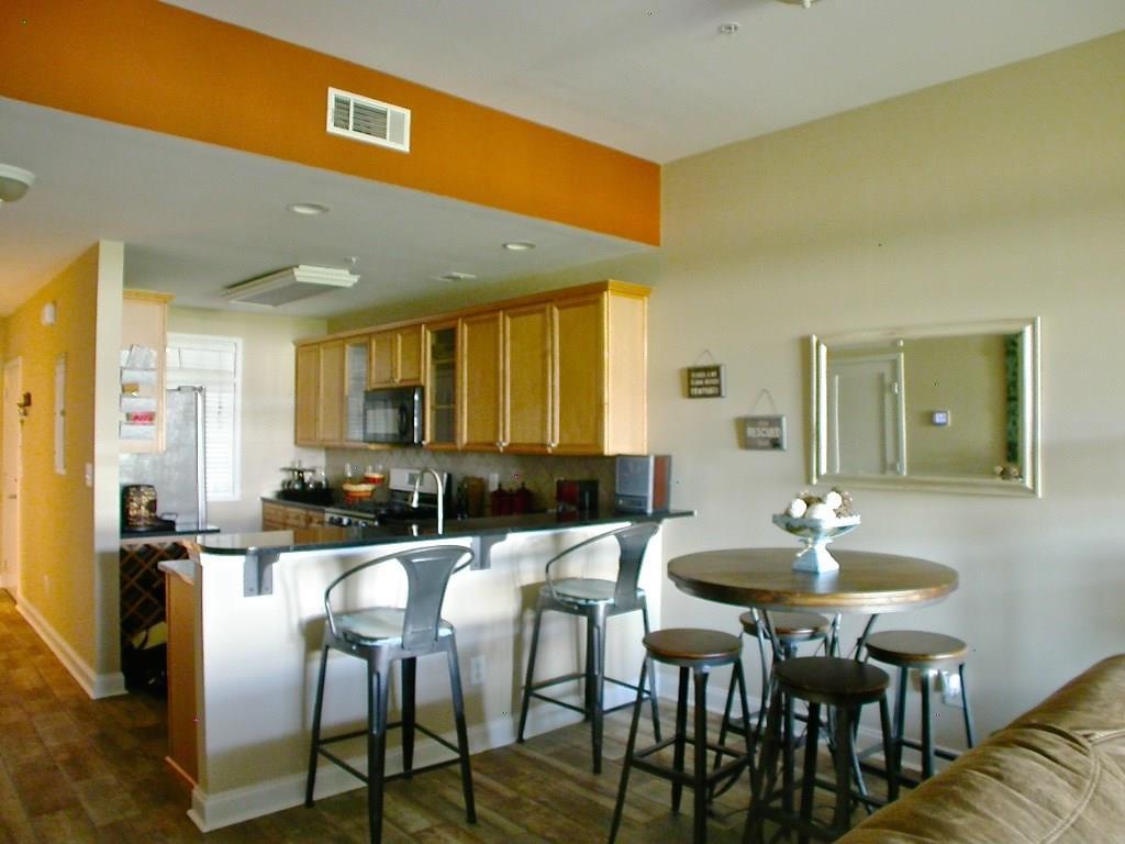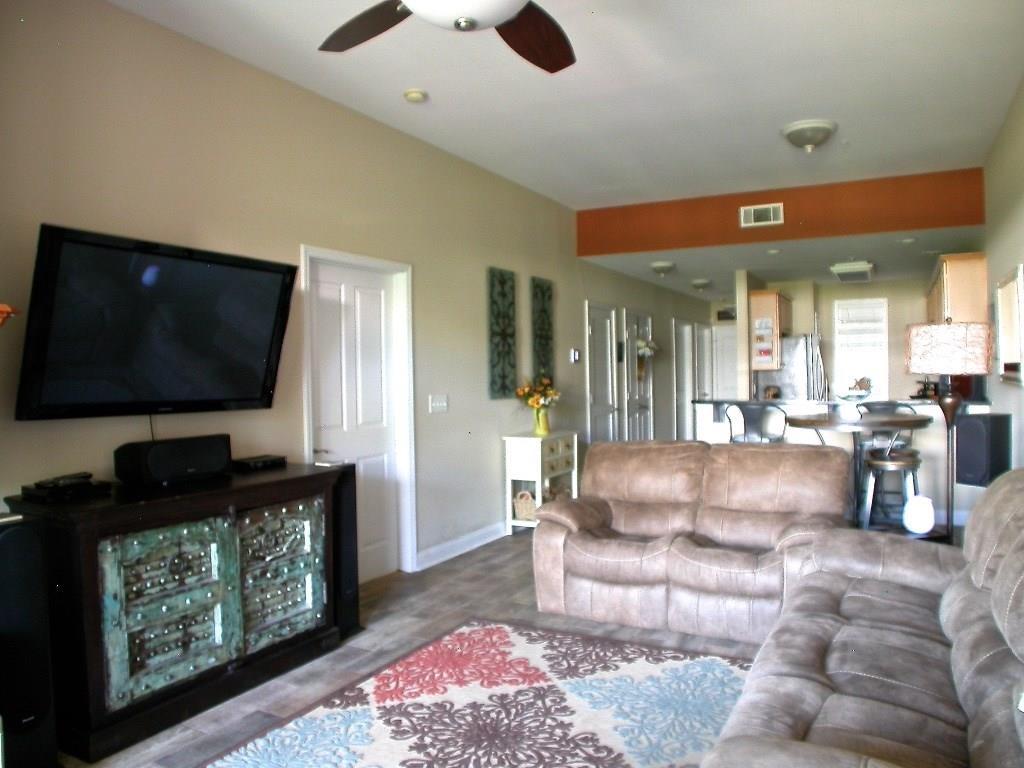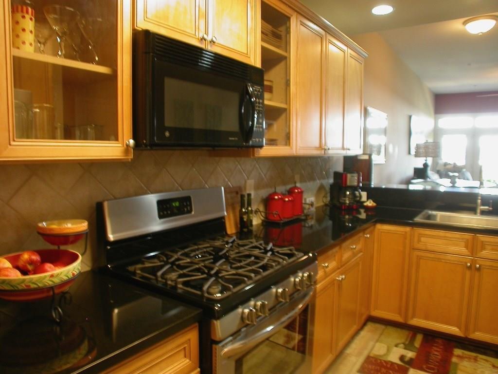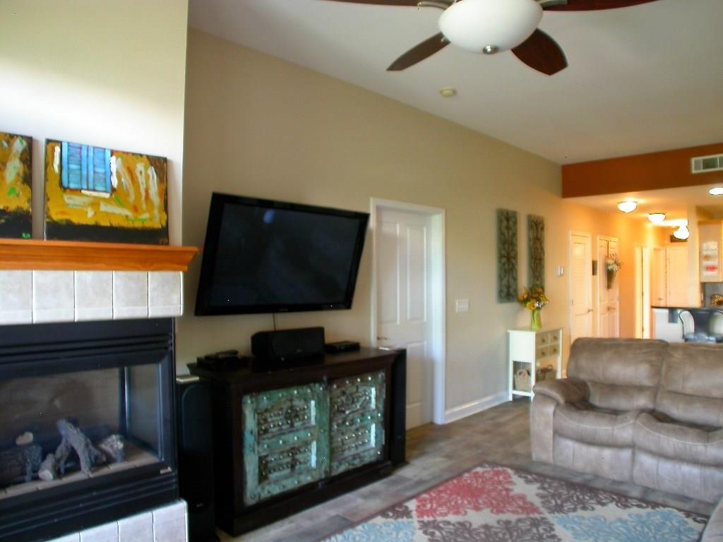 Amazing Roswell Sq location ~ walk to restaurants, shops & live music! Shows like a model w/NEW: gorgeous wood-look tile flr thru-out, HVAC system, SS kit appl plus over-sized sink & faucet, prof installed custom closet, enclosed blinds across rear drs & windows, water heater, toilets & int paint! Maple kit w/granite ctops, wine cabinet & brkfst bar! Trey ceiling & dbl shower in master. Din area opens to fam rm w/corner gas fp overlooking lrg veranda w/pocket screen drs. Convenient to guest parking, Vickery Creek Trail & more! Drive under parking incl 2 deeded spots.