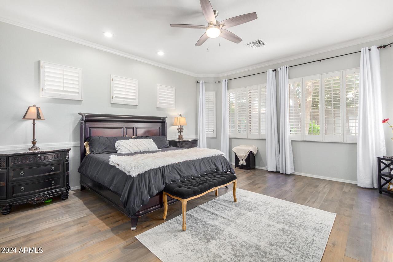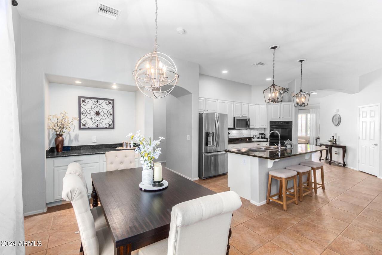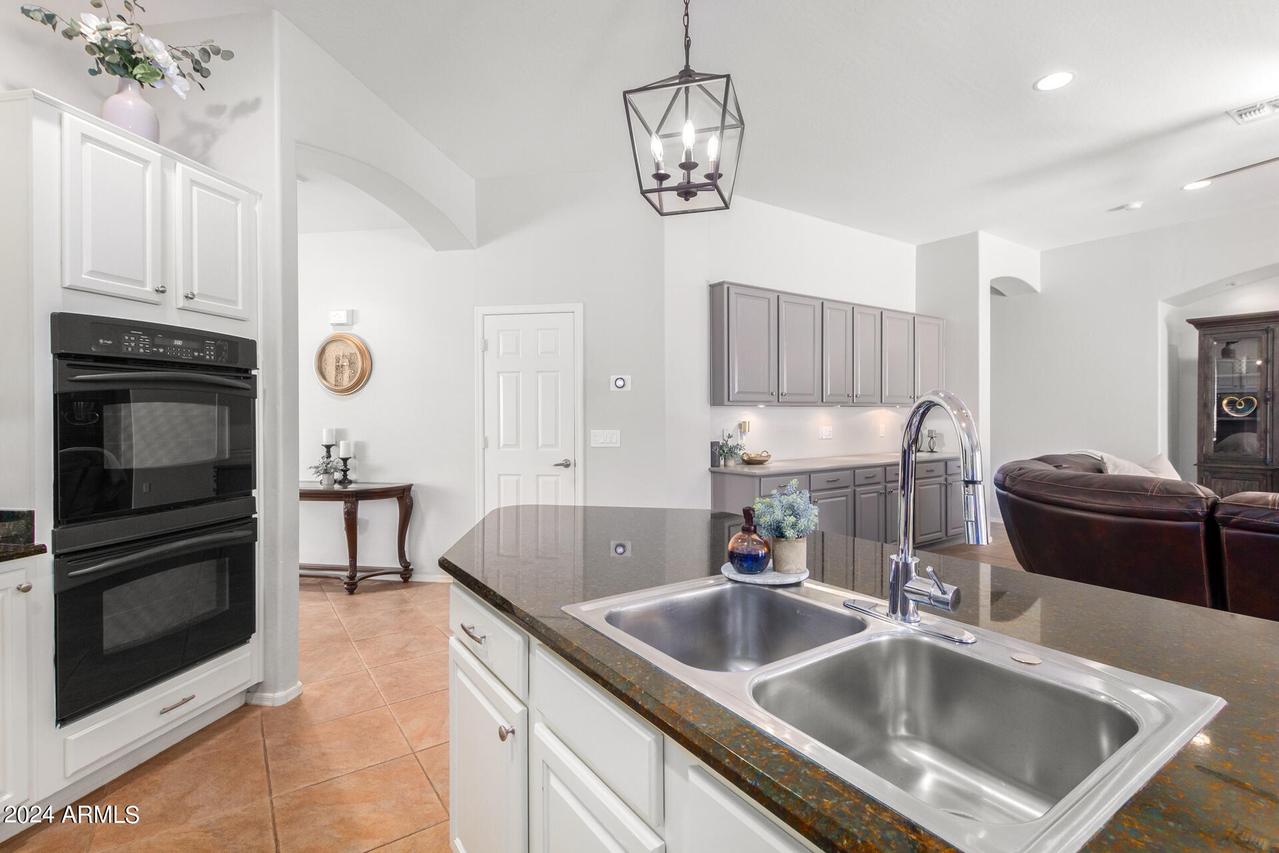MODEL SHARP * Single Level Meritage Home * 4 Bedrooms (3 Ensuite) * Split * 3 Bathrooms * Plus Den and 2.5-Car Garage in sought after Amber Hills Gated Community * This beautiful, energy-efficient home features an open floor plan with tasteful designer touches throughout. Shows like a model. The open kitchen is a chef's dream, equipped with lighted white wood cabinetry, all stainless-steel appliances, a smooth electric cooktop, double ovens, a built-in microwave, a huge center island with gleaming granite countertops, white subway tile backsplash, and a large walk-in pantry. Adjacent to the kitchen is the dining area, featuring a buffet breakfront that matches the kitchen design and overhead lighting. The great room boasts a beautiful, cozy white stone fireplace . . . built-in upper and lower undermount lighted cabinets. There is no lack of storage in this home. The spacious Primary suite includes a bay window, crown molding, and an ensuite with a super shower, glass block double entrance with dual shower heads, dual sinks, and a huge walk-in closet. Wood shutters throughout the home enhance its clean and modern feel. The office is open to the formal living and dining area, complete with a closet and can easily be enclosed to create a fifth bedroom or provide added privacy for a den or hobby space. The 2.5-car garage offers ample space, accommodating a small third car or golf cart with side door exit. The outdoor landscape is immaculate, featuring a new irrigation system, low-maintenance synthetic grass in the back, and vibrant, mature plantings. The backyard is a serene oasis with a high back wall ensuring privacy with extended patio. The exterior of the home was freshly painted in Nov 2023, and the owned solar panels contribute to significant cost savings. The Amber Hills community boasts hiking and walking trails, multiple grass & desert pathways that lead to the Sonoran Desert, a lush park, a large Ramada, and a BBQ area with magnificent mountain views. Close to several top-rated schools, it is conveniently located near shops and dining with quick and easy access to the I-17 freeway. Single-story homes rarely come on the market in this community, making this a unique opportunity you don't want to miss! See it Today!