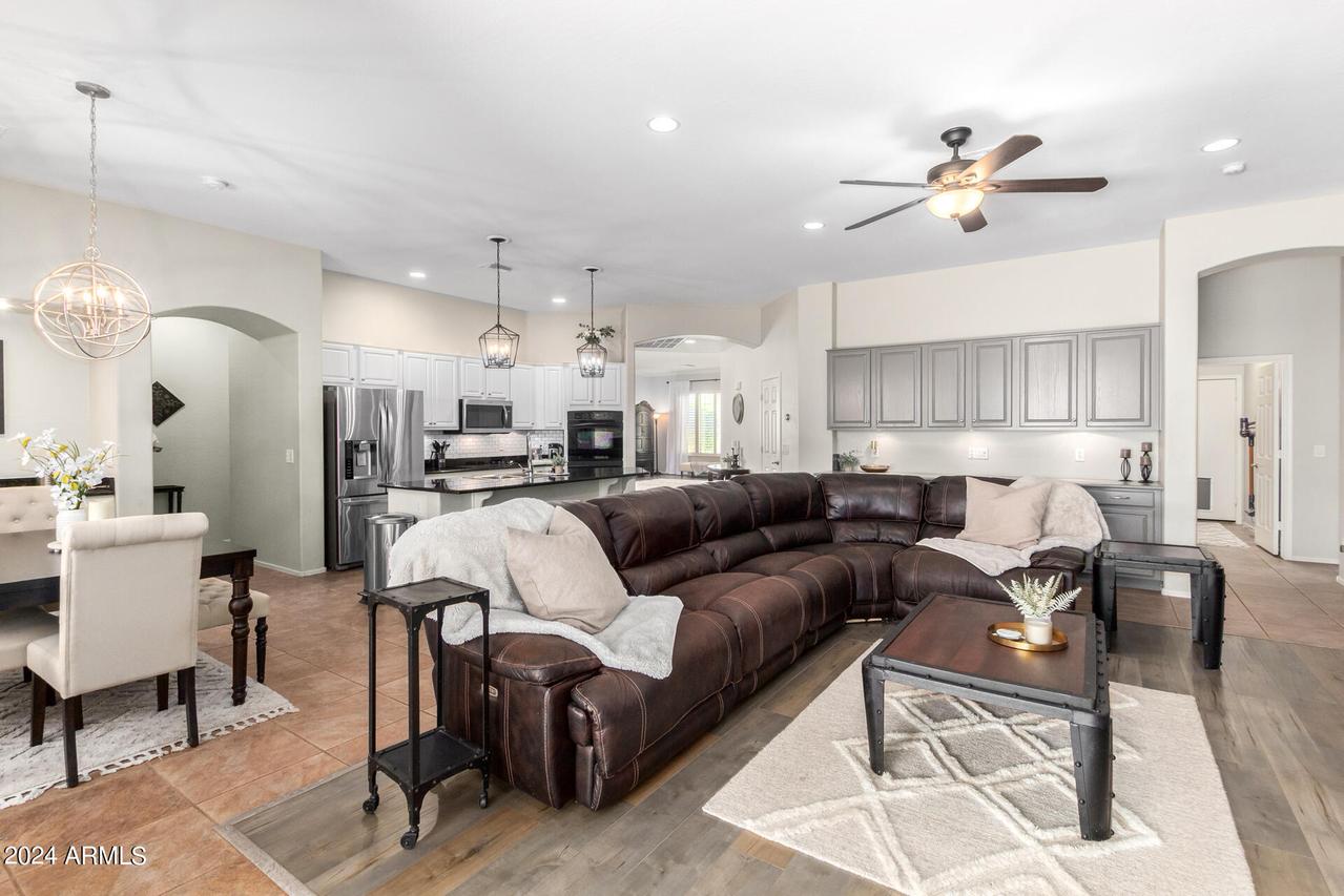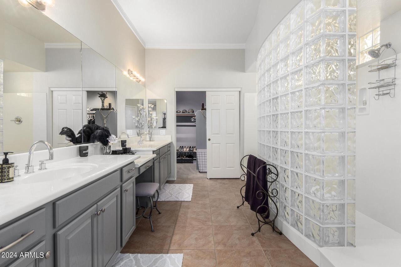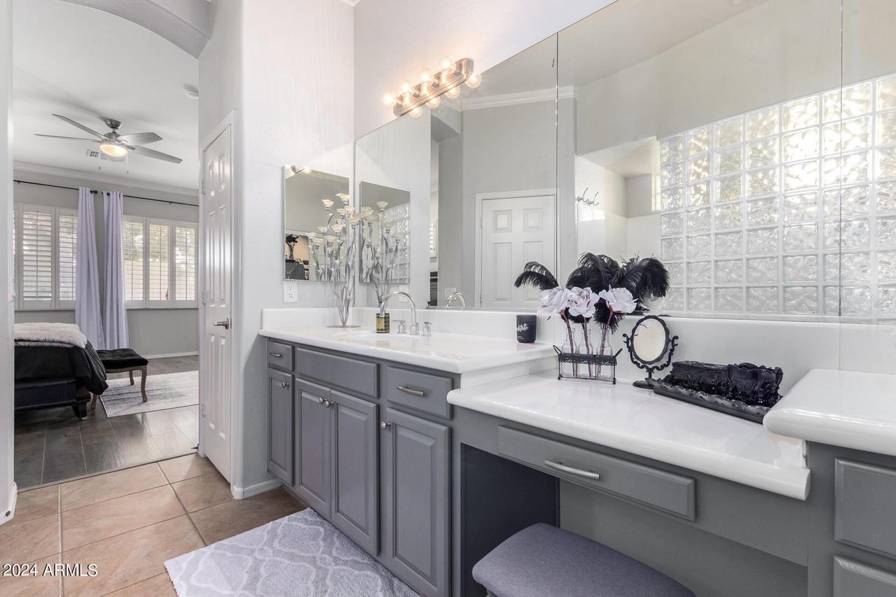 MODEL SHARP * Single Level Meritage Home * 4 Bedrooms (3 Ensuite) * Split * 3 Bathrooms * Plus Den and 2.5-Car Garage in sought after Amber Hills Gated Community * This beautiful, energy-efficient home features an open floor plan with tasteful designer touches throughout. Shows like a model. The open kitchen is a chef's dream, equipped with lighted white wood cabinetry, all stainless-steel appliances, a smooth electric cooktop, double ovens, a built-in microwave, a huge center island with gleaming granite countertops, white subway tile backsplash, and a large walk-in pantry. Adjacent to the kitchen is the dining area, featuring a buffet breakfront that matches the kitchen design and overhead lighting. The great room boasts a beautiful, cozy white stone fireplace . . . built-in upper and lower undermount lighted cabinets. There is no lack of storage in this home. The spacious Primary suite includes a bay window, crown molding, and an ensuite with a super shower, glass block double entrance with dual shower heads, dual sinks, and a huge walk-in closet. Wood shutters throughout the home enhance its clean and modern feel. The office is open to the formal living and dining area, complete with a closet and can easily be enclosed to create a fifth bedroom or provide added privacy for a den or hobby space. The 2.5-car garage offers ample space, accommodating a small third car or golf cart with side door exit. The outdoor landscape is immaculate, featuring a new irrigation system, low-maintenance synthetic grass in the back, and vibrant, mature plantings. The backyard is a serene oasis with a high back wall ensuring privacy with extended patio. The exterior of the home was freshly painted in Nov 2023, and the owned solar panels contribute to significant cost savings. The Amber Hills community boasts hiking and walking trails, multiple grass & desert pathways that lead to the Sonoran Desert, a lush park, a large Ramada, and a BBQ area with magnificent mountain views. Close to several top-rated schools, it is conveniently located near shops and dining with quick and easy access to the I-17 freeway. Single-story homes rarely come on the market in this community, making this a unique opportunity you don't want to miss! See it Today!