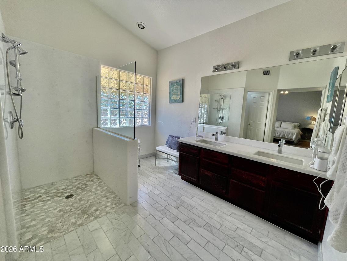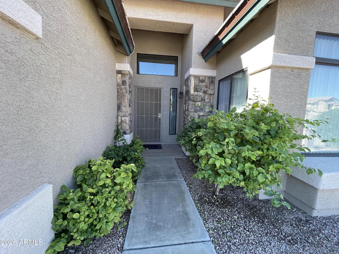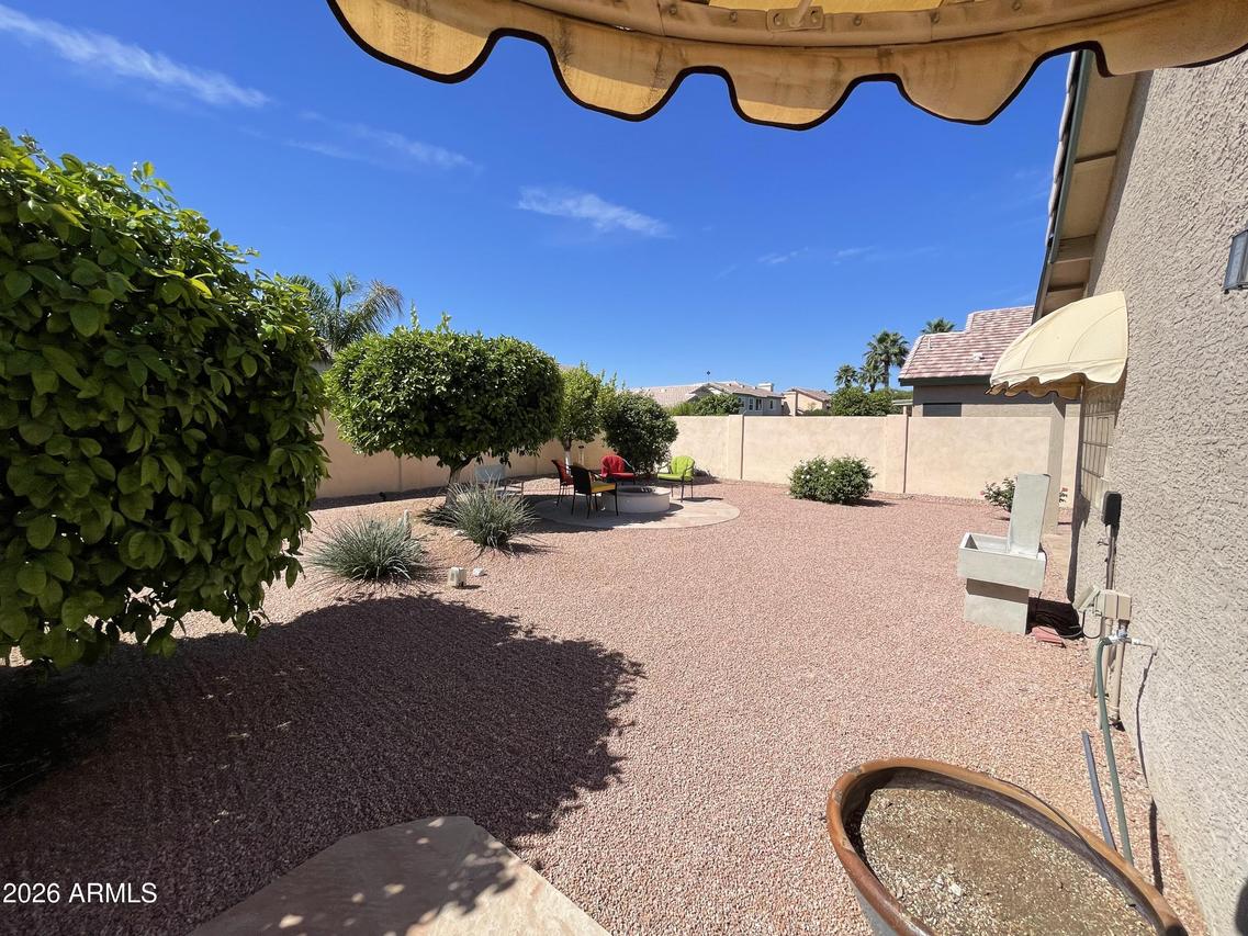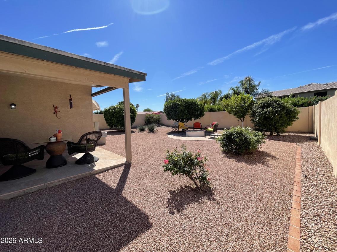 Beautifully maintained 3-bedroom, 2-bath gem with a 2-car garage, ideally situated on a cul-de-sac lot in a highly desirable area. This lovingly cared for home features Vaulted ceilings throughout and a spacious, open floor plan with ceramic tile floors. The updated kitchen offers gleaming quartz countertops, a light and bright eat-in breakfast area, and a pantry for added storage. The primary suite is a true retreat with a remodeled ensuite bath featuring a stunning marble roll-in shower, marble flooring and countertops, dual sinks, a walk-in closet, and a glass block window for natural light. A sliding door leads to a private flagstone patio with awning cover. Secondary bedrooms are generously sized with Vaulted ceilings and laminate flooring. The great room is open and airy, perfect for entertaining to include a formal dining area. The backyard is quiet and expansive with block fencing, a flagstone firepit area, and mature citrus trees including grapefruit, orange, and lemon. A spacious side yard includes an elevated garden bed. Major updates include a new roof in 2024 and HVAC and water heater replaced in 2022. This is a true gem that has been meticulously cared for. Do not miss this little treasure! Fantastic location near the redeveloped Paradise Valley Mall area--a vibrant hub for shopping, dining, and modern living--with convenient access to the SR-51 & Loop 101 freeways.