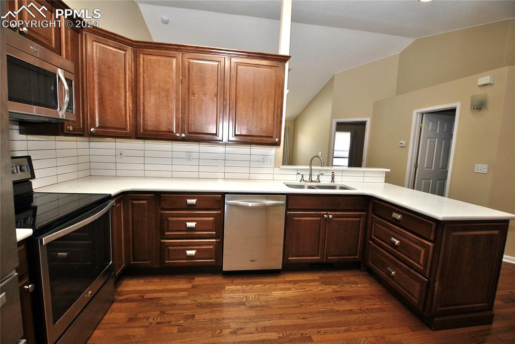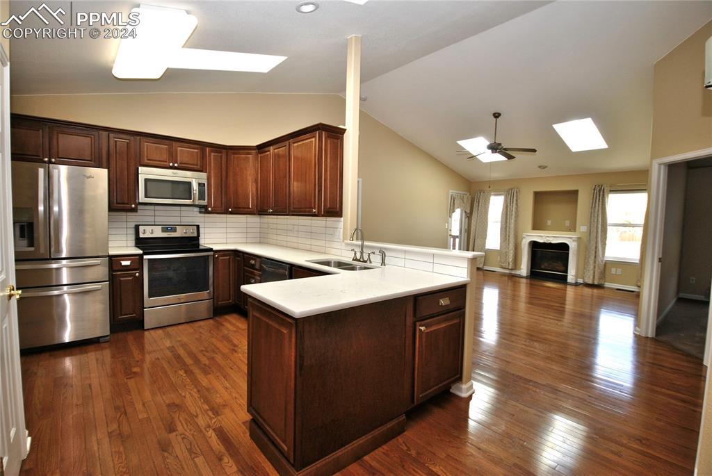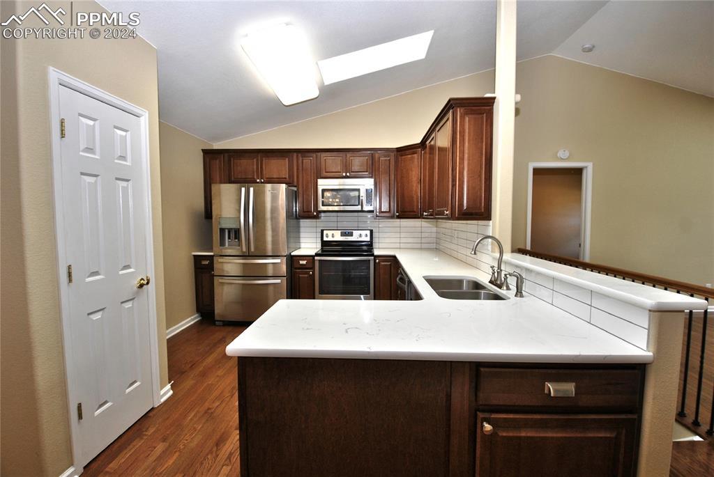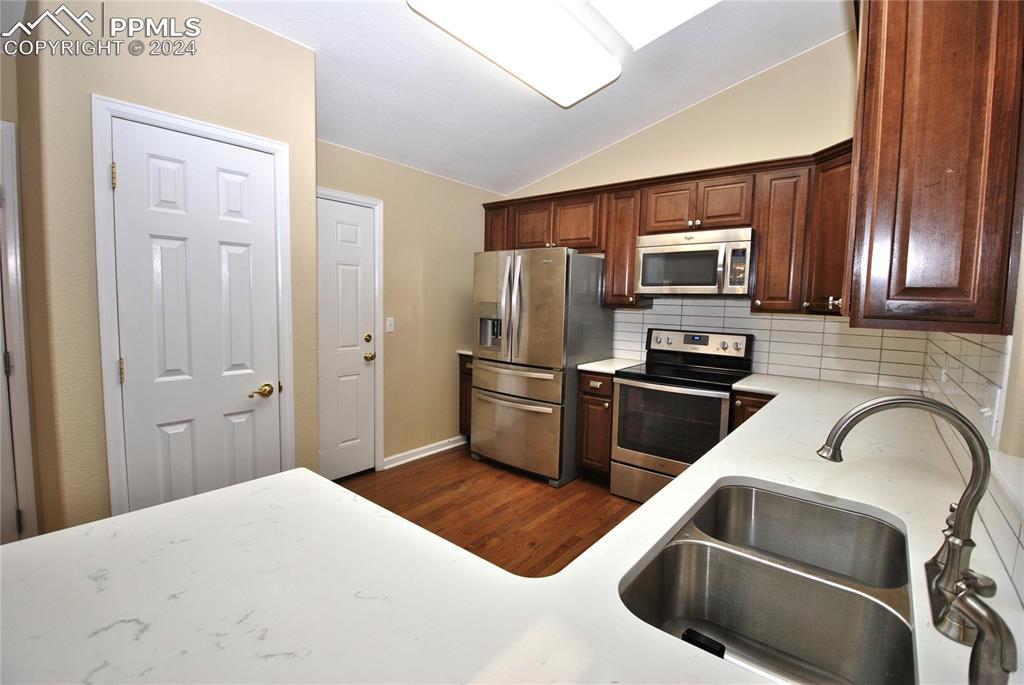 BEAUTIFUL STUCCO RANCHER!! Townhome in gated Peak View Villas. All 1 level living with gorgeous hardwood floors in most of the main level. Kitchen is complete with quartz counters, wood cabinets, eating area and Stainless Steel appliances. Big open living room area that walks out to the rear patio is also hardwood with gas fireplace, vaulted ceilings and skylight. Luxury main level master suite includes 5 piece tiled bath with soaking tub and rain shower and main level laundry. The finished basement has big family room and game room plus another big bedroom and bath. Central A/C, designer paint, designer touchers throughout and Custom blinds. Perfect location and added security with gated entry.