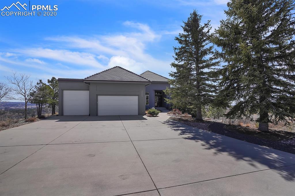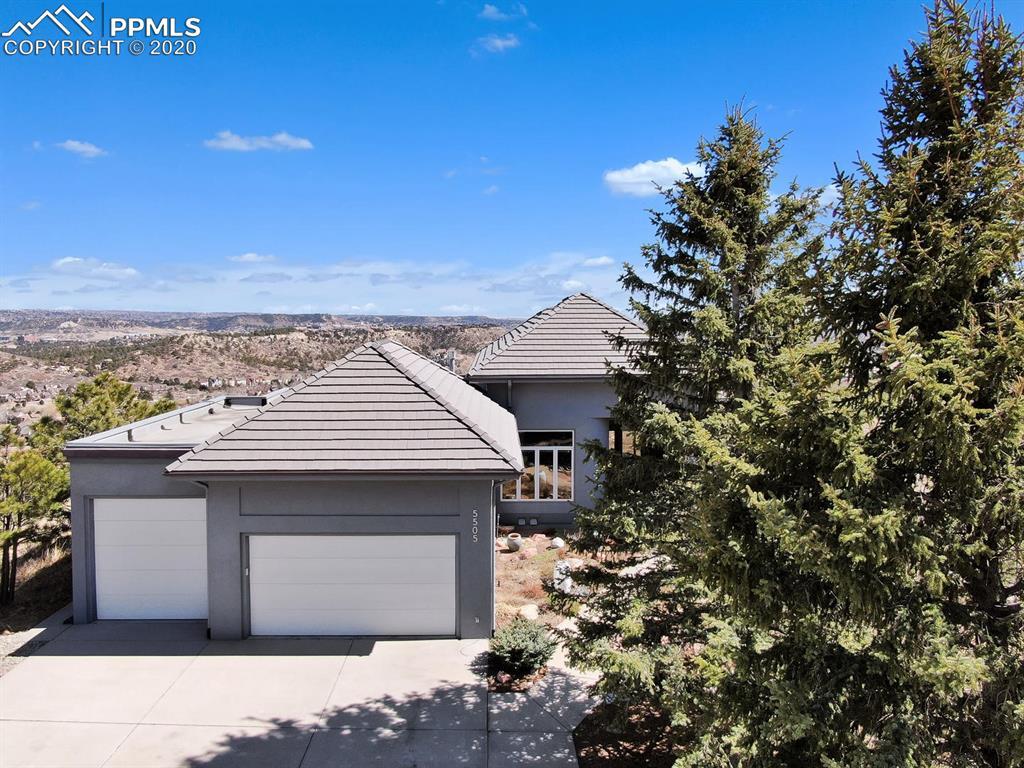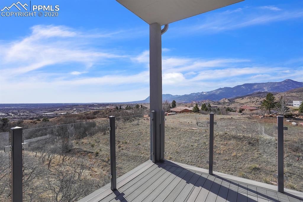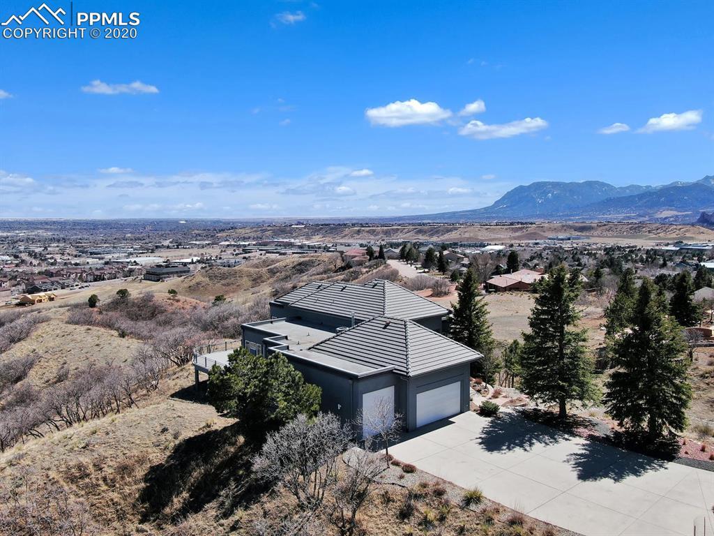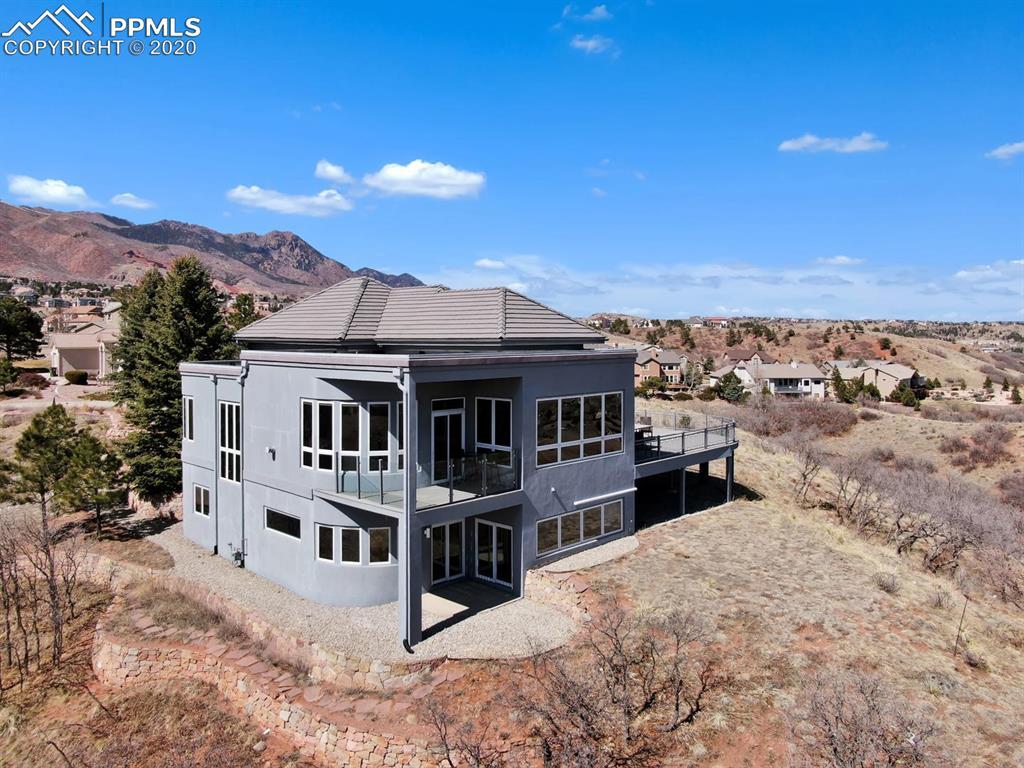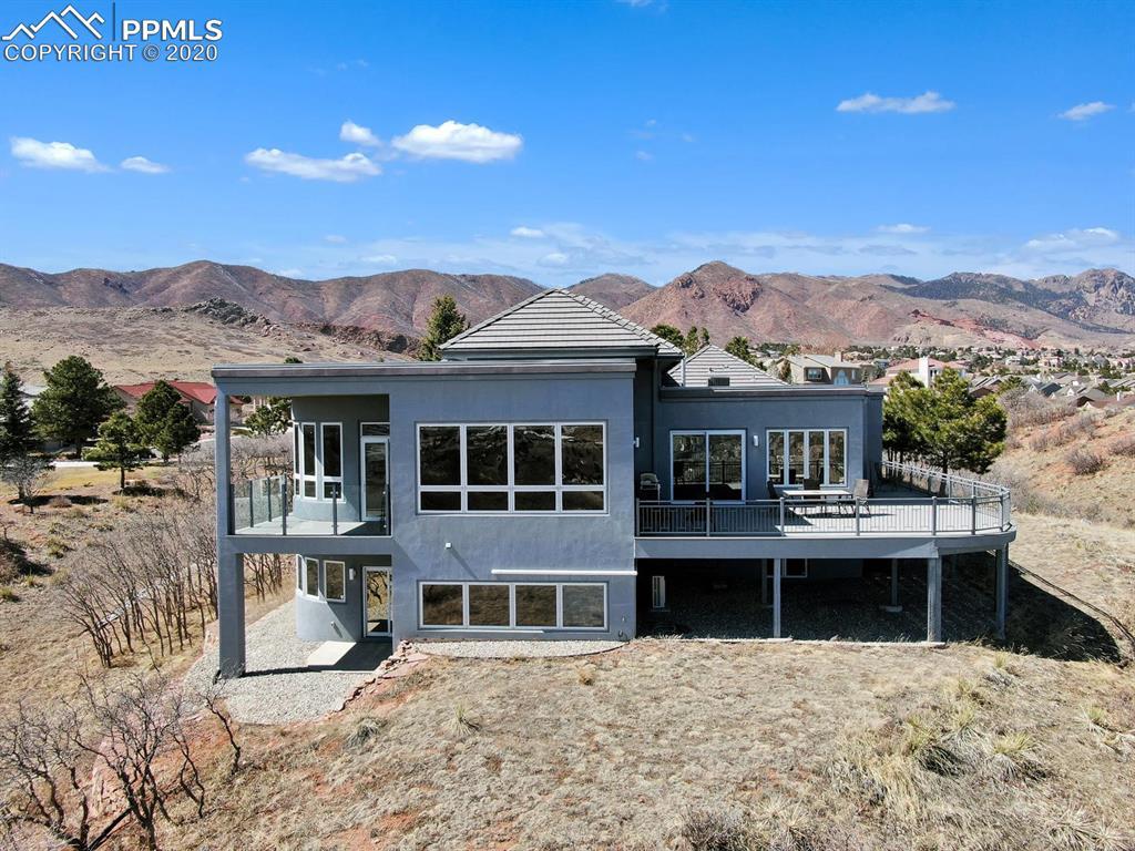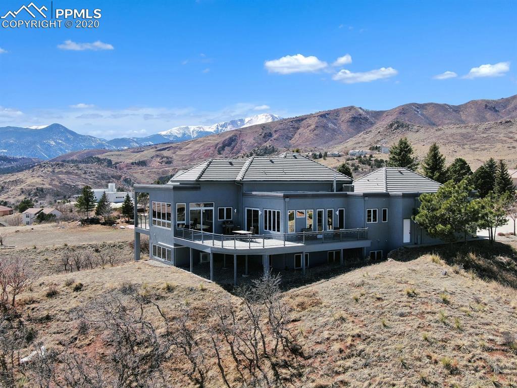 TOP OF THE WORLD VIEWS OF PIKES PEAK, COLORADO SPRINGS as far as you can see. 1.41 acres of scrub oak and natural beauty. Modern contemporary rancher with tinted windows, stucco and tile exterior. Inside gorgeous tile and wood floors, luxury gourmet kitchen with 2 dishwashers, top of the line appliances and huge eating area. Everything is PURE CUSTOM, cabinets, light fixtures, plumbing fixtures EVERYTHING. Beautiful master suite with dual entry, walk in closet and access to gigantic composite deck. Oversized garage includes RV Space. Full finished walkout basement with huge bar, rec and entertainment areas. Bonus shop and storage plus wine cellar. Everything is here plus Radiant floor heat and Central A/C.