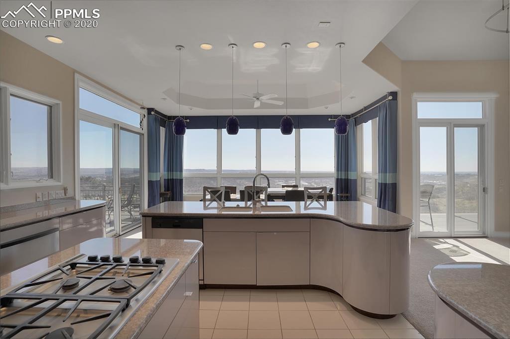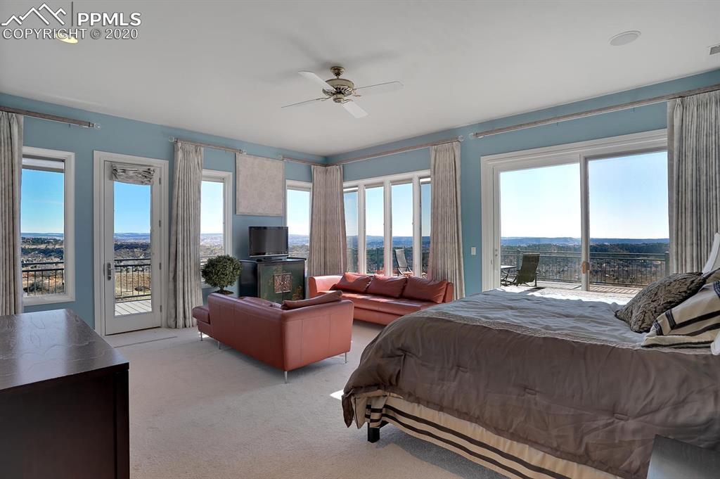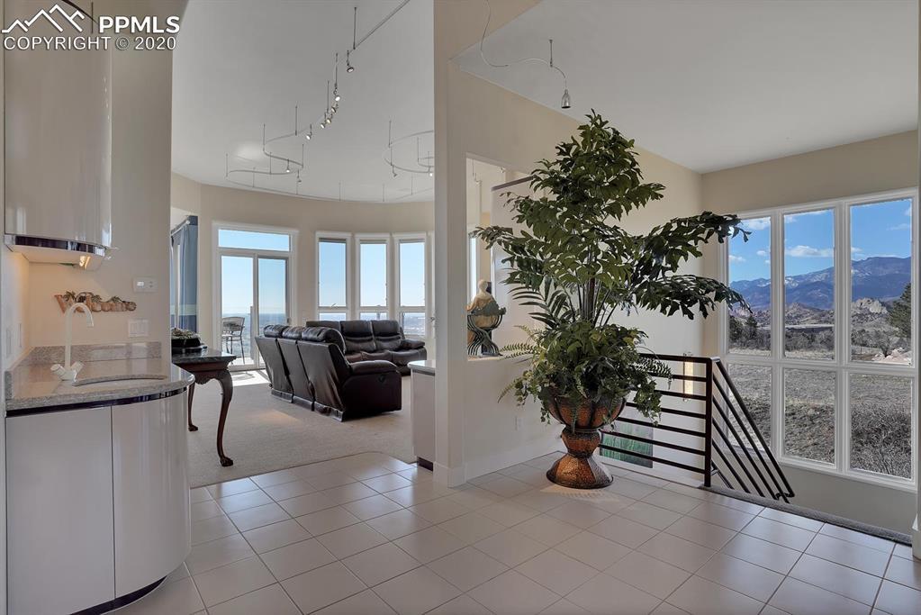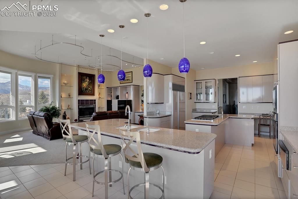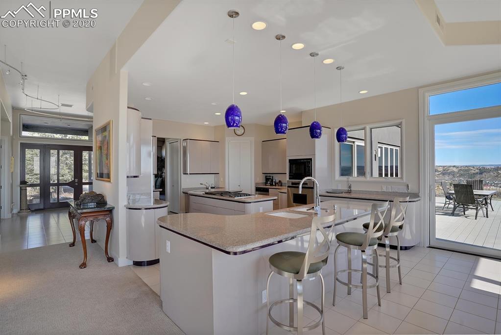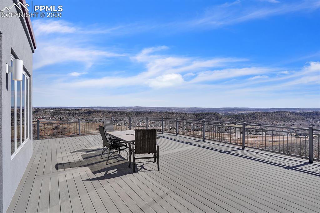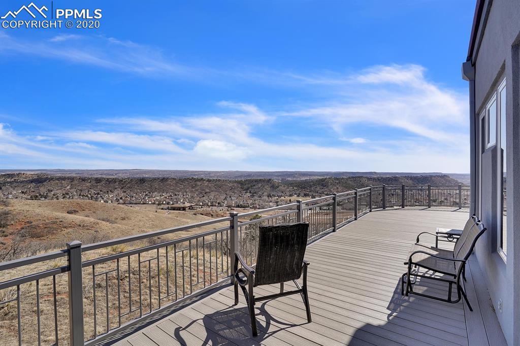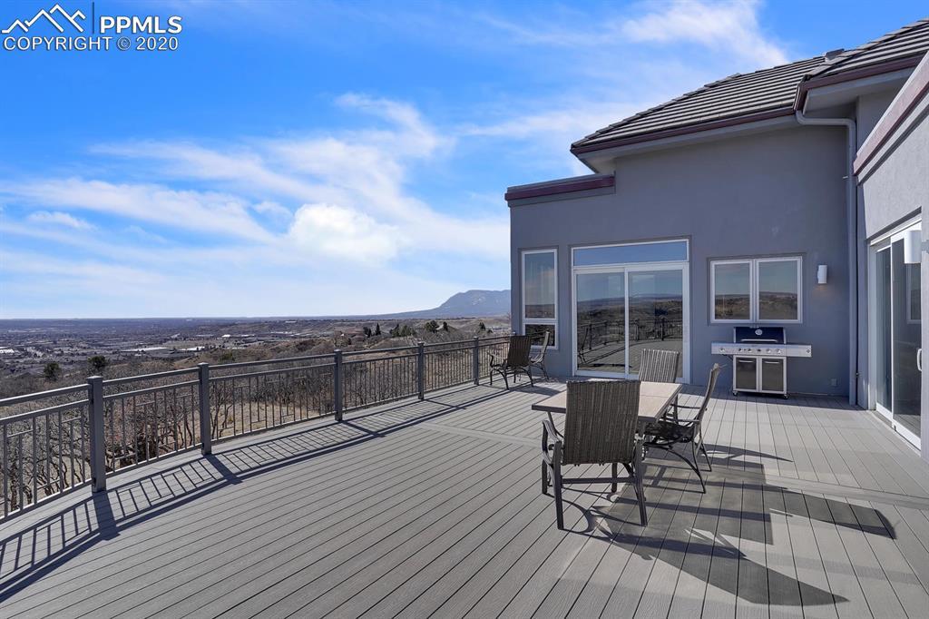 TOP OF THE WORLD VIEWS OF PIKES PEAK, COLORADO SPRINGS as far as you can see. 1.41 acres of scrub oak and natural beauty. Modern contemporary rancher with tinted windows, stucco and tile exterior. Inside gorgeous tile and wood floors, luxury gourmet kitchen with 2 dishwashers, top of the line appliances and huge eating area. Everything is PURE CUSTOM, cabinets, light fixtures, plumbing fixtures EVERYTHING. Beautiful master suite with dual entry, walk in closet and access to gigantic composite deck. Oversized garage includes RV Space. Full finished walkout basement with huge bar, rec and entertainment areas. Bonus shop and storage plus wine cellar. Everything is here plus Radiant floor heat and Central A/C.
