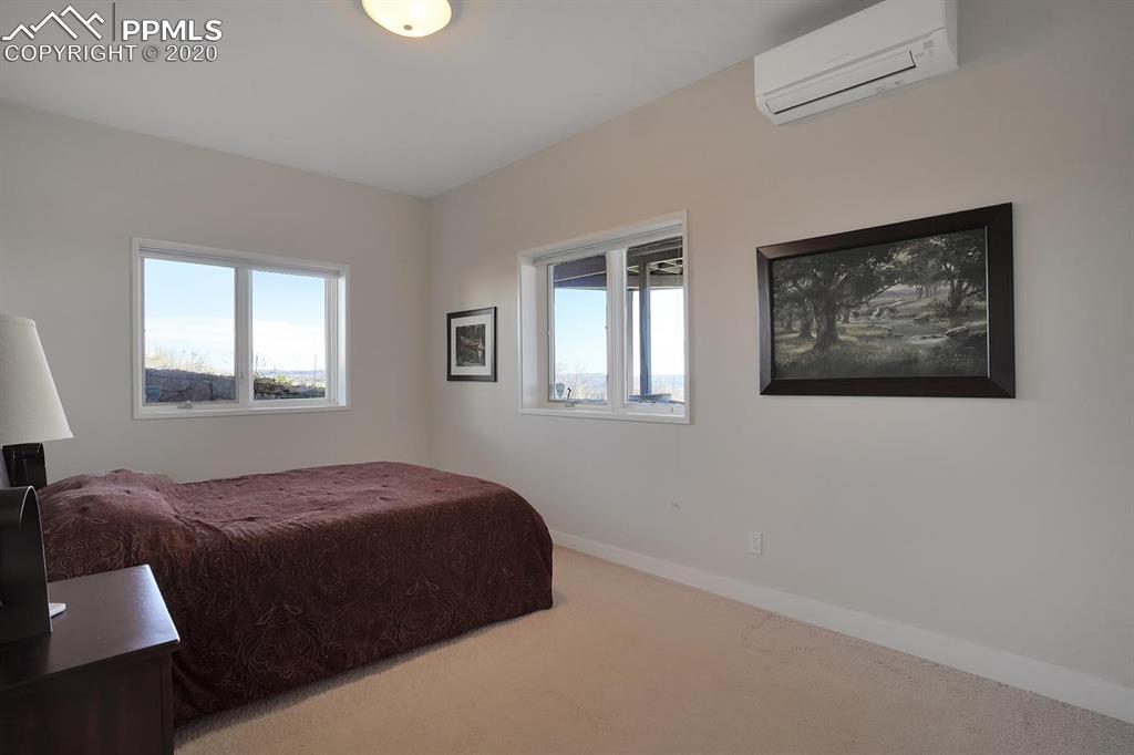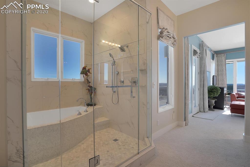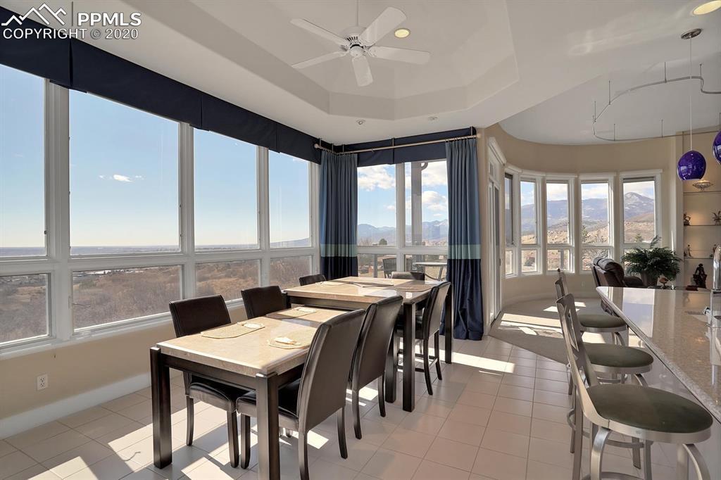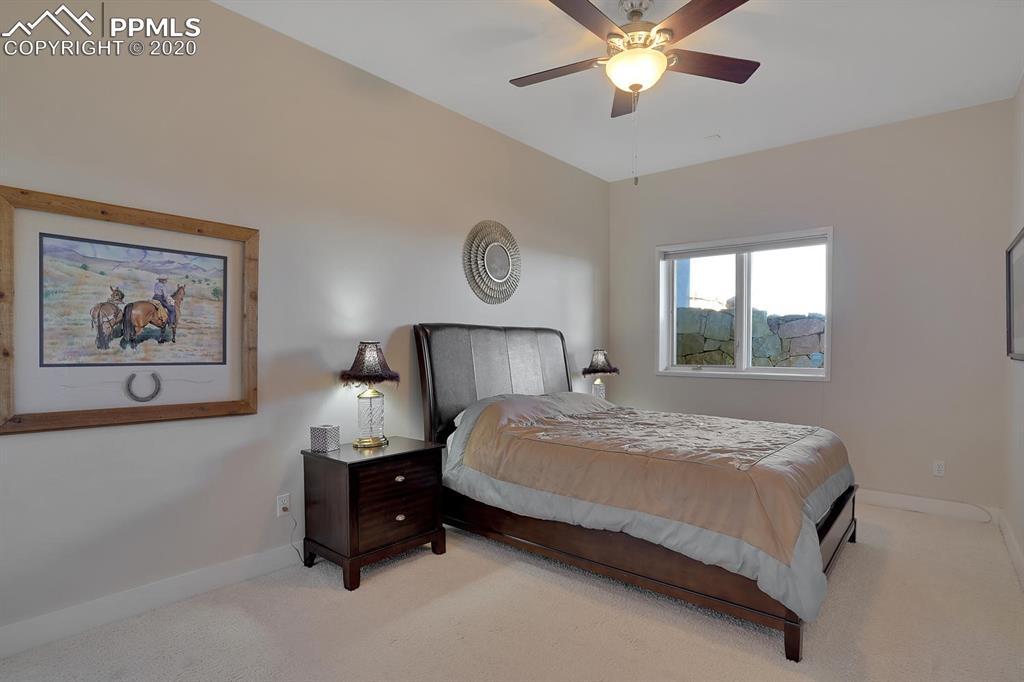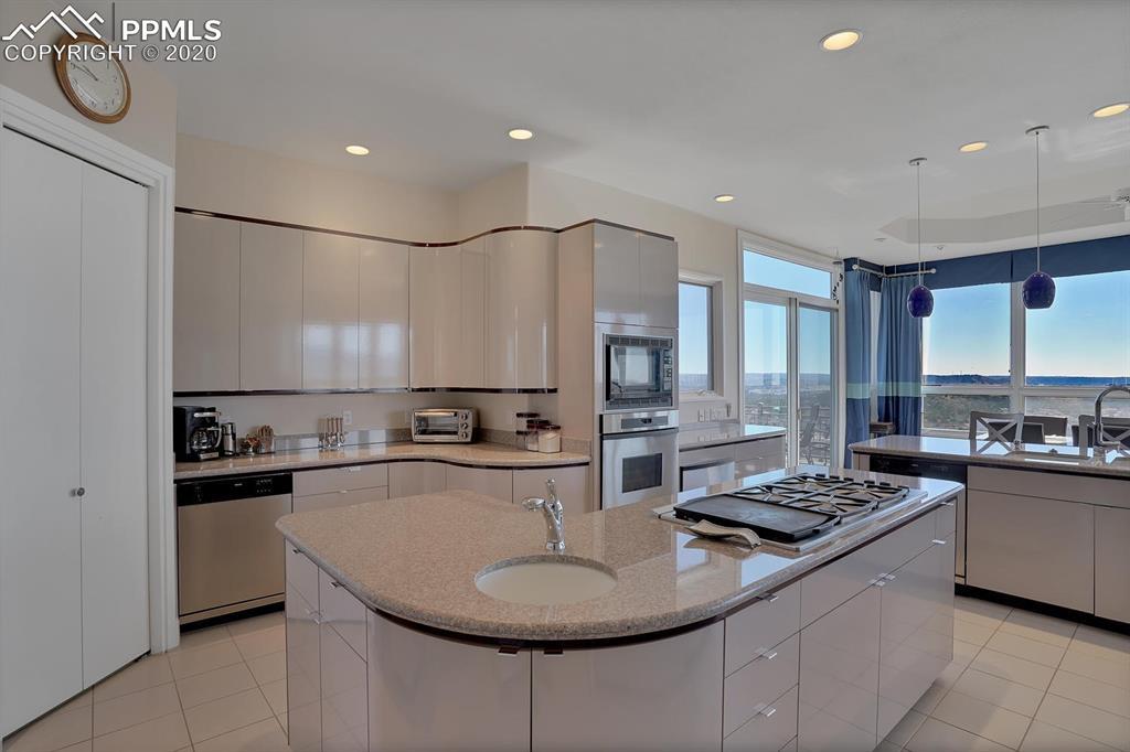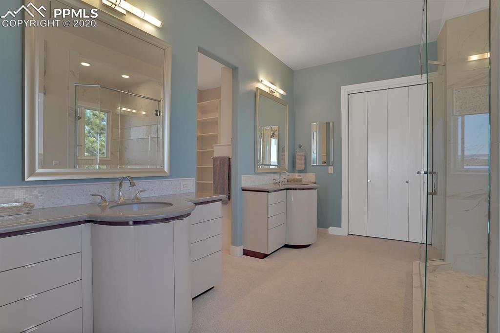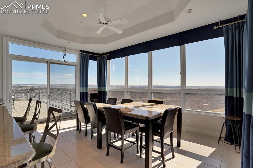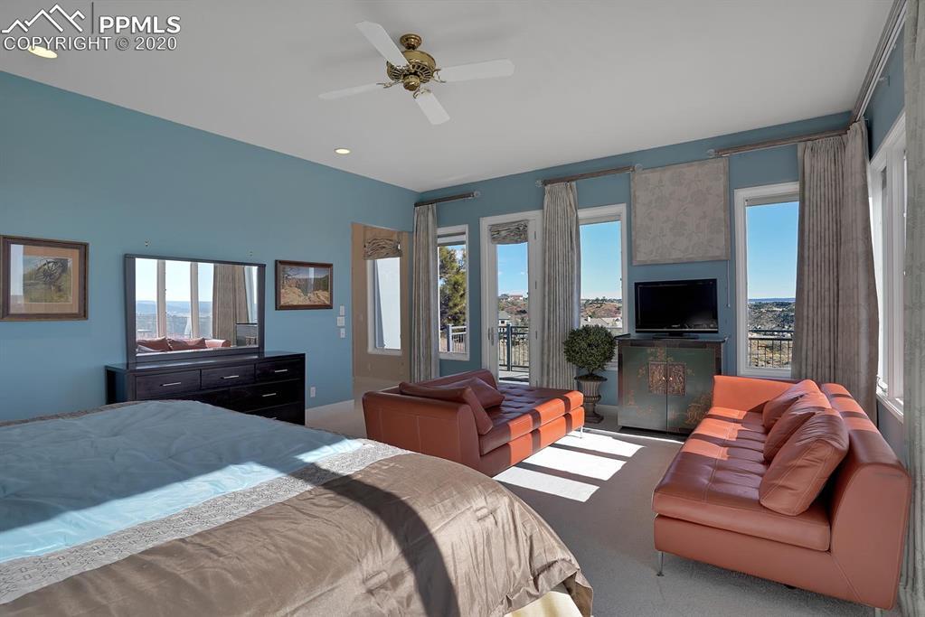 TOP OF THE WORLD VIEWS OF PIKES PEAK, COLORADO SPRINGS as far as you can see. 1.41 acres of scrub oak and natural beauty. Modern contemporary rancher with tinted windows, stucco and tile exterior. Inside gorgeous tile and wood floors, luxury gourmet kitchen with 2 dishwashers, top of the line appliances and huge eating area. Everything is PURE CUSTOM, cabinets, light fixtures, plumbing fixtures EVERYTHING. Beautiful master suite with dual entry, walk in closet and access to gigantic composite deck. Oversized garage includes RV Space. Full finished walkout basement with huge bar, rec and entertainment areas. Bonus shop and storage plus wine cellar. Everything is here plus Radiant floor heat and Central A/C.