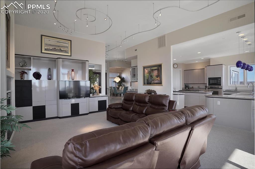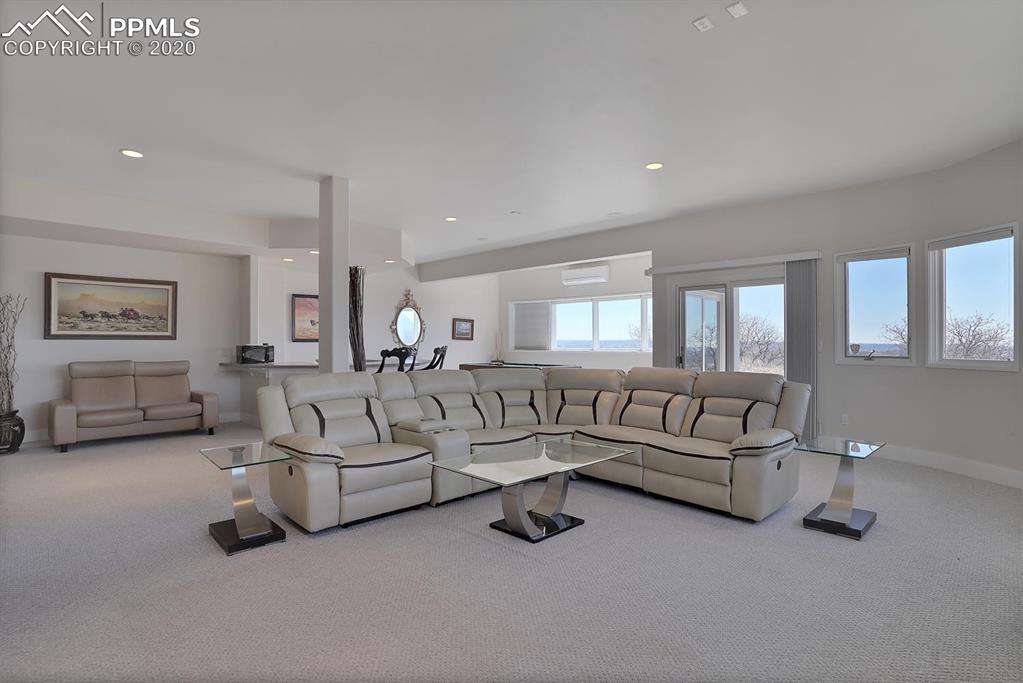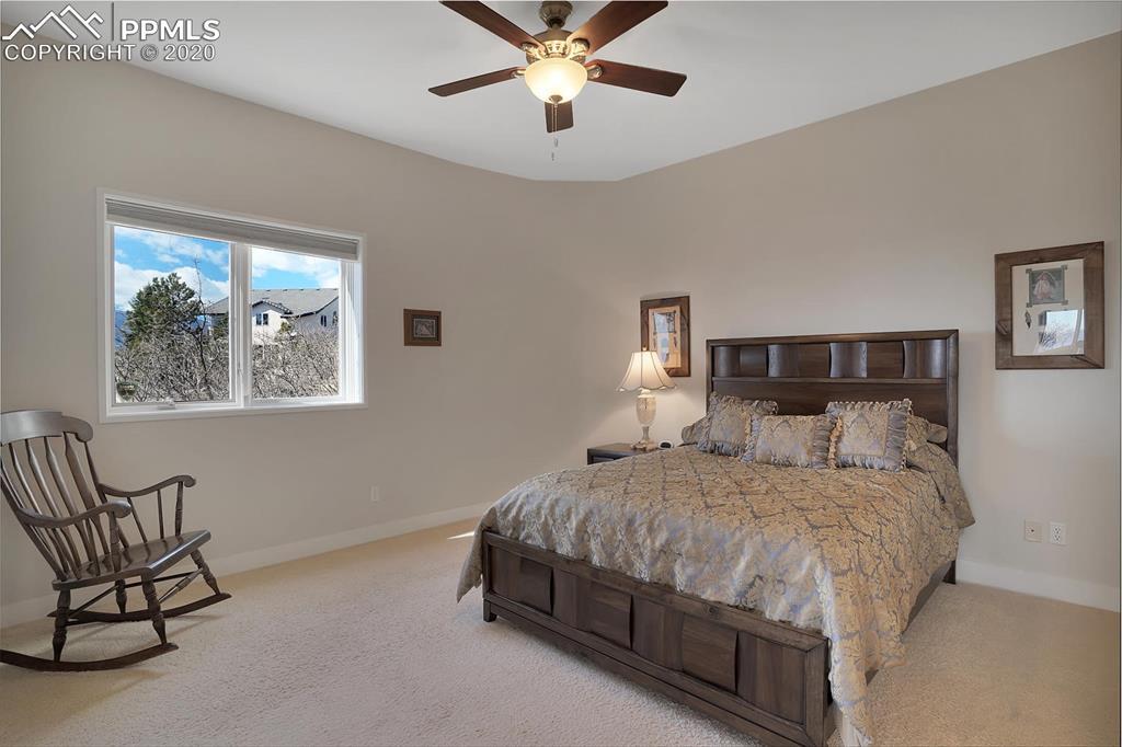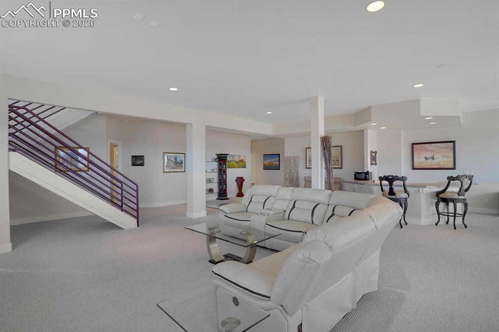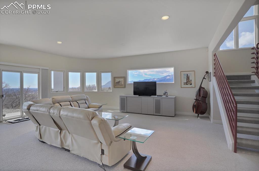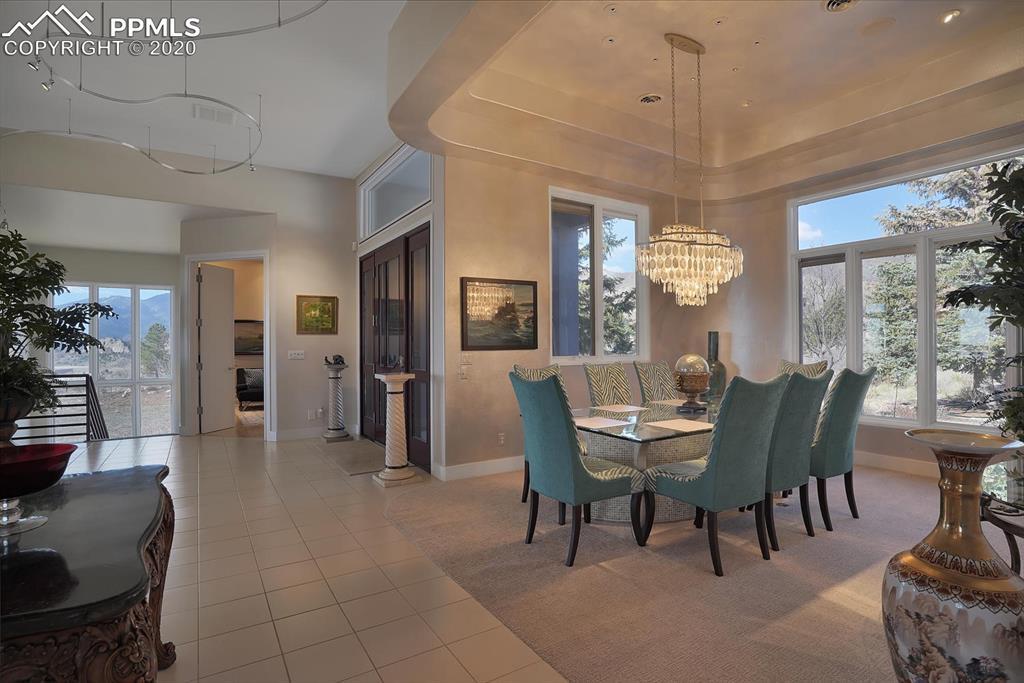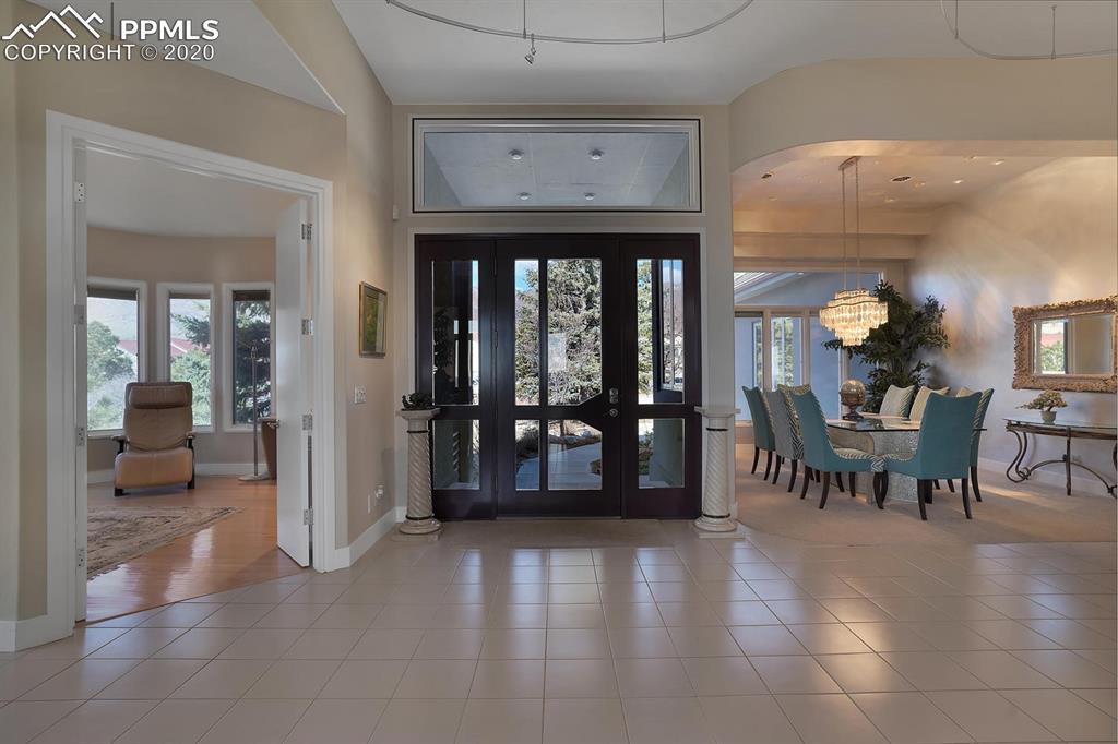TOP OF THE WORLD VIEWS OF PIKES PEAK, COLORADO SPRINGS as far as you can see. 1.41 acres of scrub oak and natural beauty. Modern contemporary rancher with tinted windows, stucco and tile exterior. Inside gorgeous tile and wood floors, luxury gourmet kitchen with 2 dishwashers, top of the line appliances and huge eating area. Everything is PURE CUSTOM, cabinets, light fixtures, plumbing fixtures EVERYTHING. Beautiful master suite with dual entry, walk in closet and access to gigantic composite deck. Oversized garage includes RV Space. Full finished walkout basement with huge bar, rec and entertainment areas. Bonus shop and storage plus wine cellar. Everything is here plus Radiant floor heat and Central A/C.