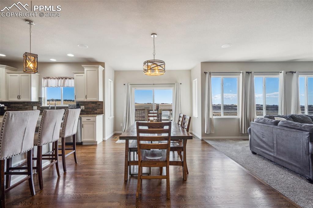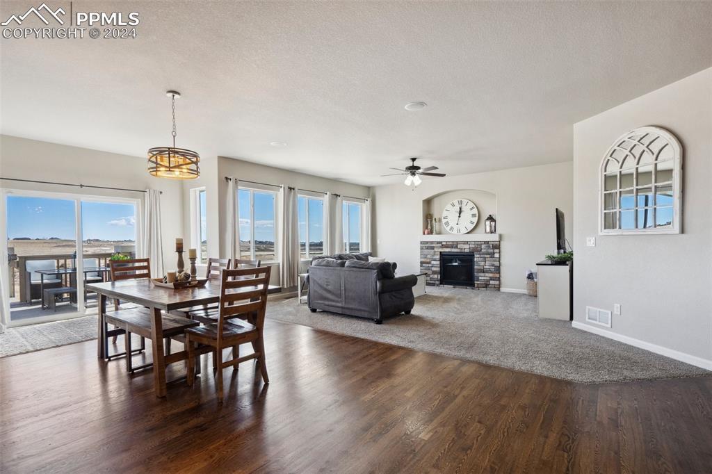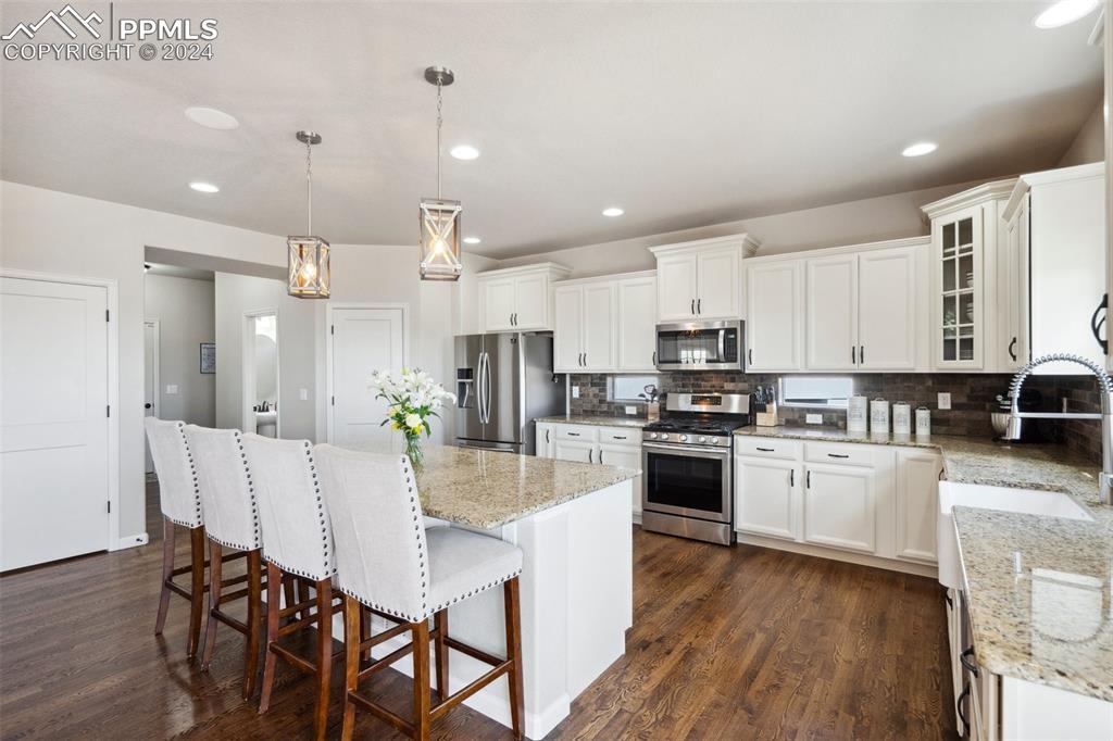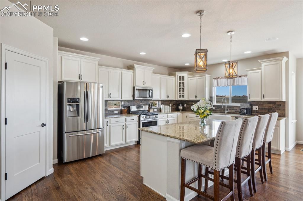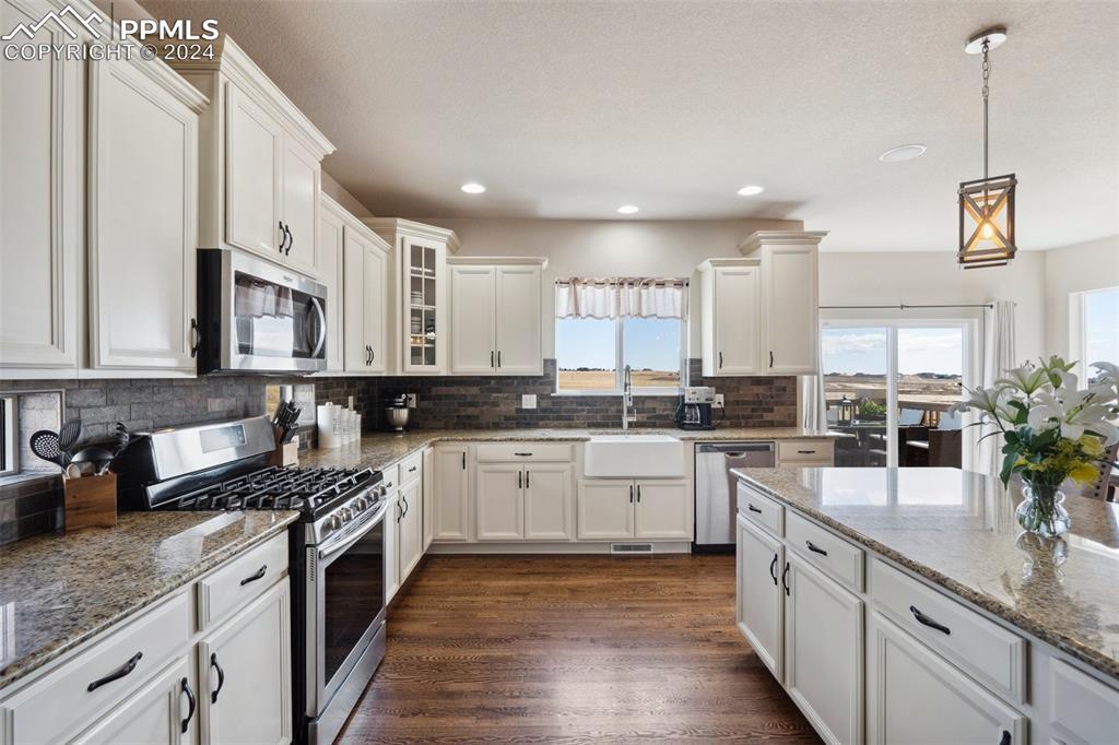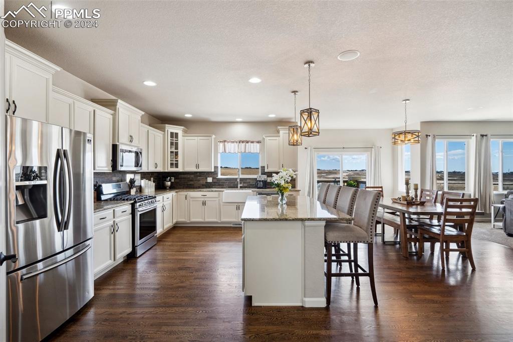 BETTER THAN A MODEL!! Brand New, Perfect condition inside and out. Professional landscaping greets you and brings you into this gorgeous home. Wood floors throughout the main level with open concept living area with spacious kitchen and island. Granite countertops gas range and upgraded Stainless Steel appliances accented by Custom antigied cabinets and upgraded light fixtures. Spectacular Mountain Views from the front and open space views in the back bordering creek, lake and walkways. Upstairs features 4 big bedrooms and luxury master suite with Custom tiled 5 piece bath with dual heads shower. The walkout basement showcases a Custom bar that you gotta see to believe with 2 fireplaces and entertainment family room. Another big bedroom with French doors and full bath. More extras include built in surround sound, Central A/C, hot tub, shed, LED custom exterior lights, tankless water heater. All in District 20 Schools!!