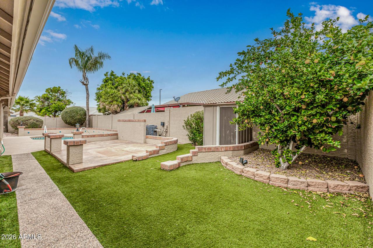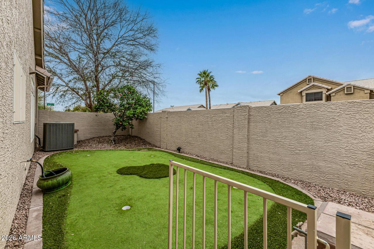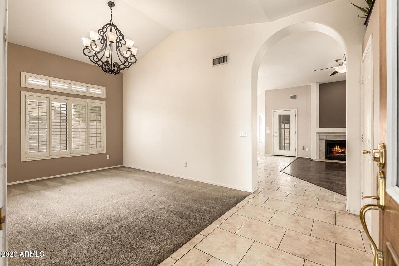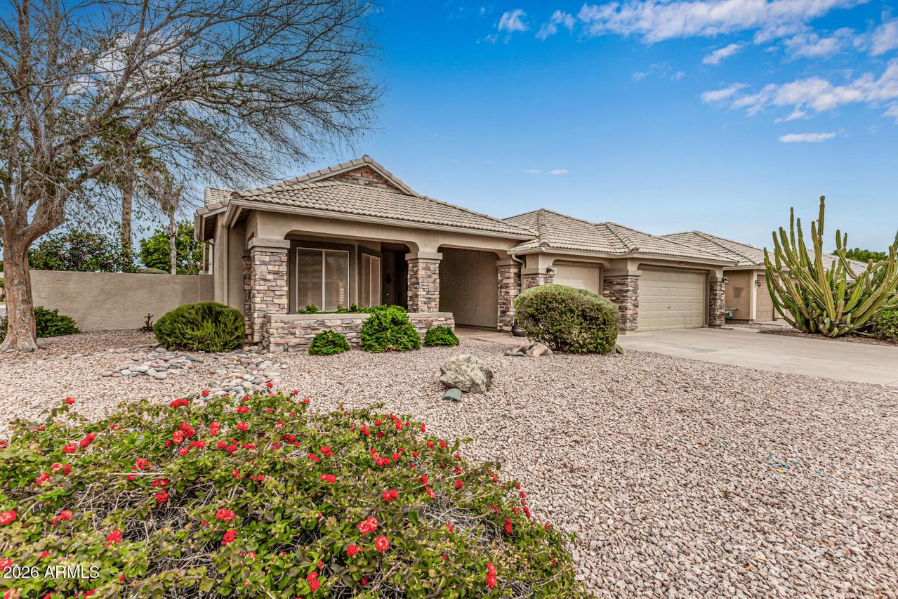 This well-maintained 4-bedroom, 2-bath home with a 3-car garage sits on a desirable corner lot and features attractive front stone elevation and a large covered front porch. The exterior has been freshly painted, and the block fence surround with interior stucco finish was recently painted as well, enhancing the overall curb appeal. Step inside to a welcoming formal living and dining room with vaulted ceilings and high-quality Polywood plantation shutters. The light and bright great room kitchen offers slab granite countertops, tile backsplash, center island, pantry, and newer black stainless-steel appliances--perfectly open to the inviting family room with a cozy fireplace and elegant hazelnut wood flooring. . . . The spacious primary suite features a private exit to the backyard patio, a walk-in closet, dual sinks, separate shower and soaking tub with a glass block window for natural light. The backyard is a true oasis with a sparkling PebbleTec pool, painted concrete patio, newer Kool Decking, lighted posts, and an elevated patio ideal for adding a gazebo or hot tub. Enjoy your own putting green, storage shed, paved side yard with garage access, plus mature orange and lemon trees. Additional highlights include an inside laundry room with utility sink and upper cabinetry, and a spacious 3-car garage offering abundant built-in storage cabinetry and a dedicated workspace. A beautiful home with incredible potential--just needing carpet and interior paint to make it your own. Ideally located near freeways, shopping, dining, Gilbert schools, parks, golf, and hiking trails. Don't miss this hidden treasure in Superstition Springs!