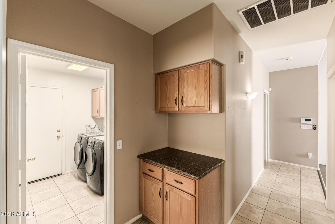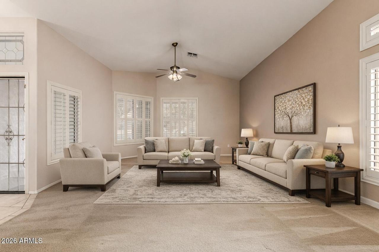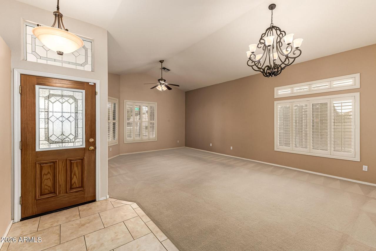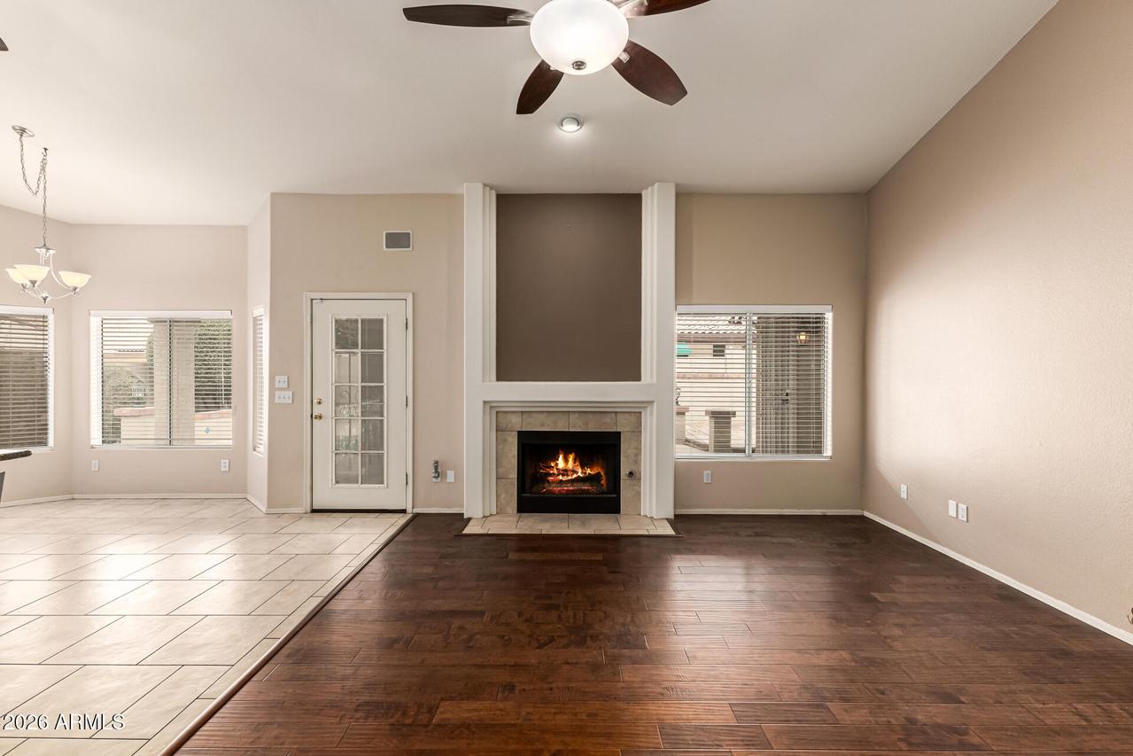 This well-maintained 4-bedroom, 2-bath home with a 3-car garage sits on a desirable corner lot and features attractive front stone elevation and a large covered front porch. The exterior has been freshly painted, and the block fence surround with interior stucco finish was recently painted as well, enhancing the overall curb appeal. Step inside to a welcoming formal living and dining room with vaulted ceilings and high-quality Polywood plantation shutters. The light and bright great room kitchen offers slab granite countertops, tile backsplash, center island, pantry, and newer black stainless-steel appliances--perfectly open to the inviting family room with a cozy fireplace and elegant hazelnut wood flooring. . . . The spacious primary suite features a private exit to the backyard patio, a walk-in closet, dual sinks, separate shower and soaking tub with a glass block window for natural light. The backyard is a true oasis with a sparkling PebbleTec pool, painted concrete patio, newer Kool Decking, lighted posts, and an elevated patio ideal for adding a gazebo or hot tub. Enjoy your own putting green, storage shed, paved side yard with garage access, plus mature orange and lemon trees. Additional highlights include an inside laundry room with utility sink and upper cabinetry, and a spacious 3-car garage offering abundant built-in storage cabinetry and a dedicated workspace. A beautiful home with incredible potential--just needing carpet and interior paint to make it your own. Ideally located near freeways, shopping, dining, Gilbert schools, parks, golf, and hiking trails. Don't miss this hidden treasure in Superstition Springs!