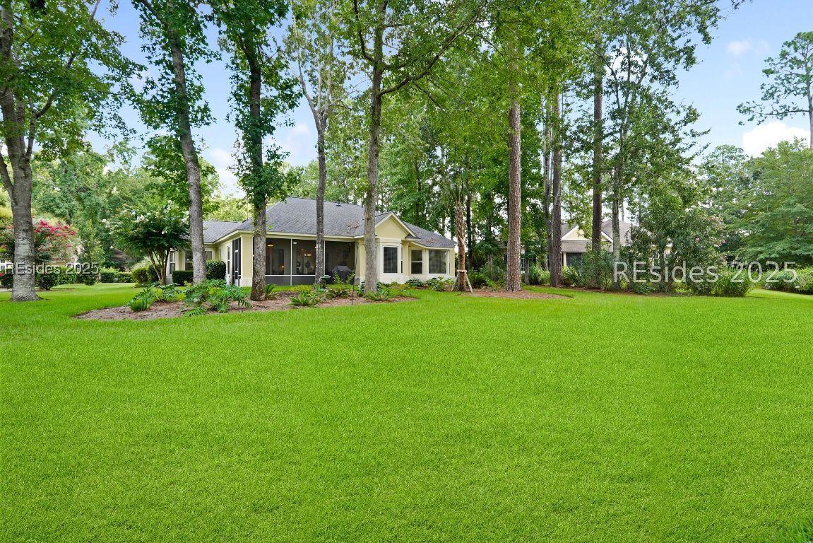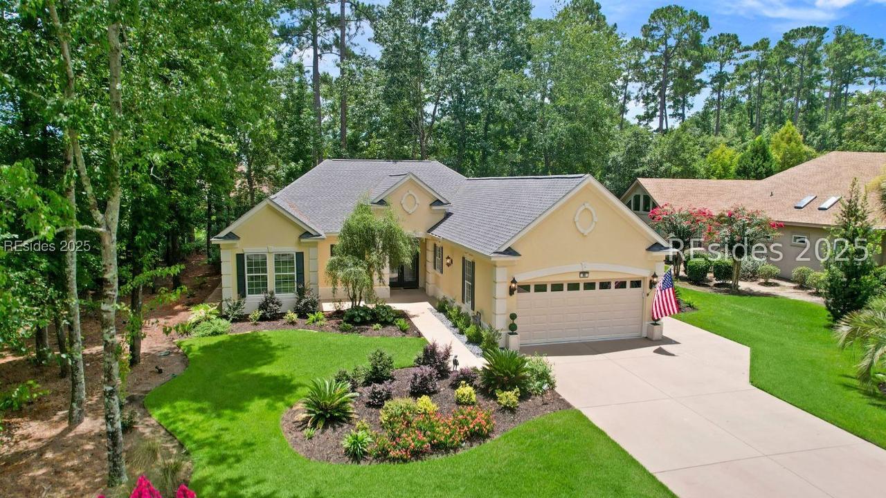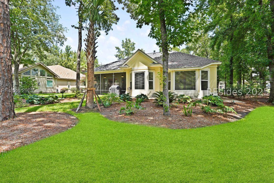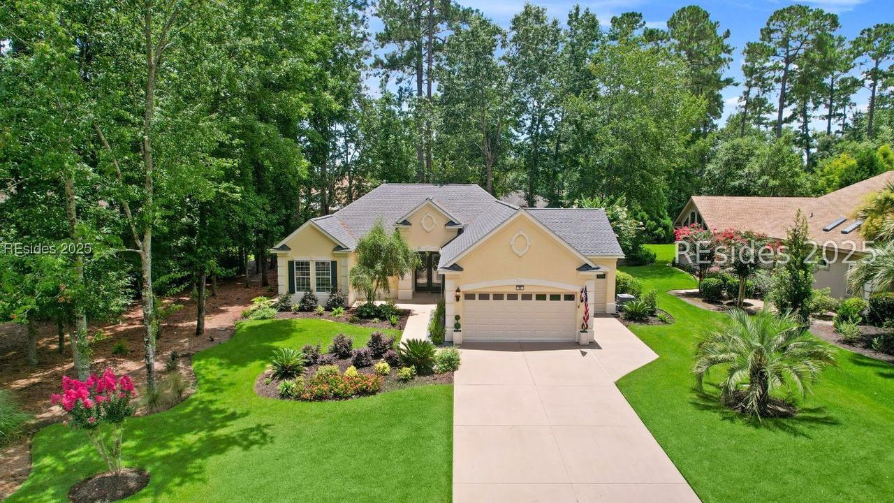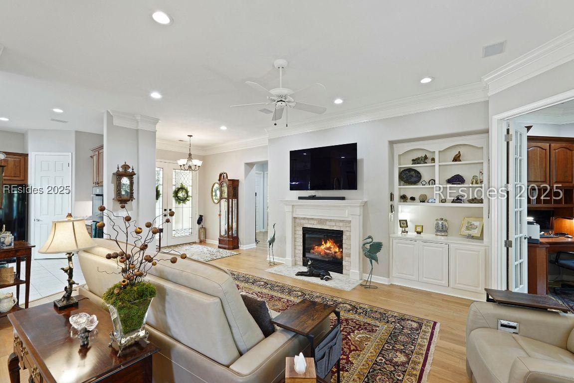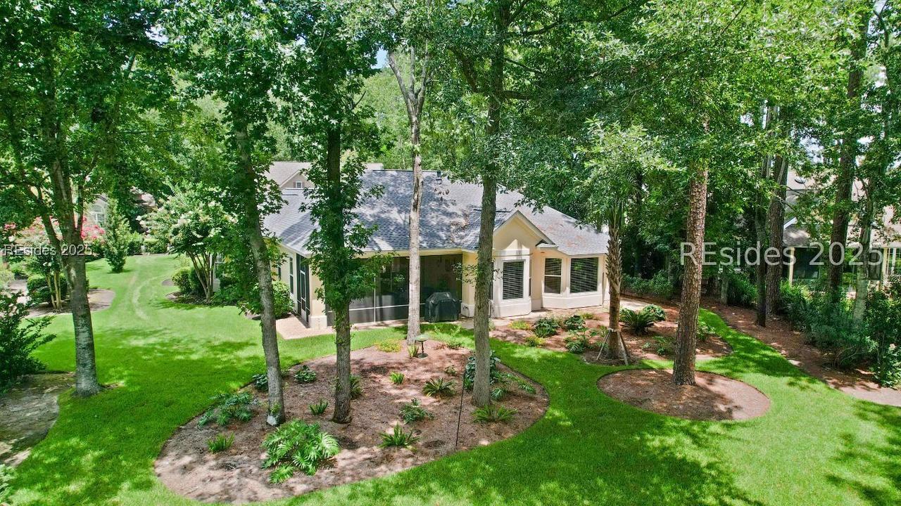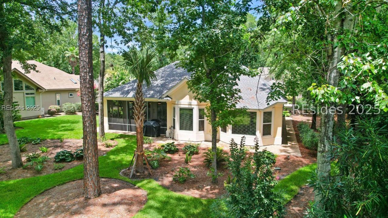 Beautiful 2 bed, 2 bath with an office that can be used as a 3rd bedroom! Lovely glass French door entry leads to an open floorplan with 10’ ceilings and huge kitchen. Great room has a gas fireplace with built-ins and crown moldings. Kitchen has lots of cabinets, granite countertops, large island with seating for 4, veggie sink. Walk-in panty and casual eating area completes the kitchen. Dining area overlooking the large screened in lanai. The office has built-ins and a bay window with storage in the seating area. Large primary bedroom suite with lovely views of the private backyard. The primary bathroom offers a dual sink vanity, separate shower, and soaking tub, plus a wonderful closet with built in organizers. Gorgeous and serene backyard with lovely landscaping, brick patio. New roof 2025, New custom shower in 2nd bath. New kitchen appliances, new ceiling fans, new recessed lights, new central vac, new garbage disposal, extensive fresh landscaping, Garage floor has new epoxy coating and garage LED lighting, 3 year old HVAC system. Two car garage with a golf cart bay!