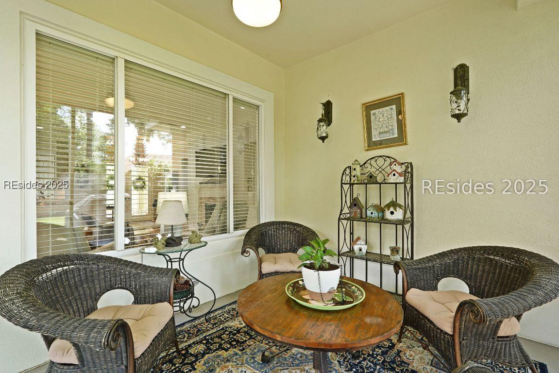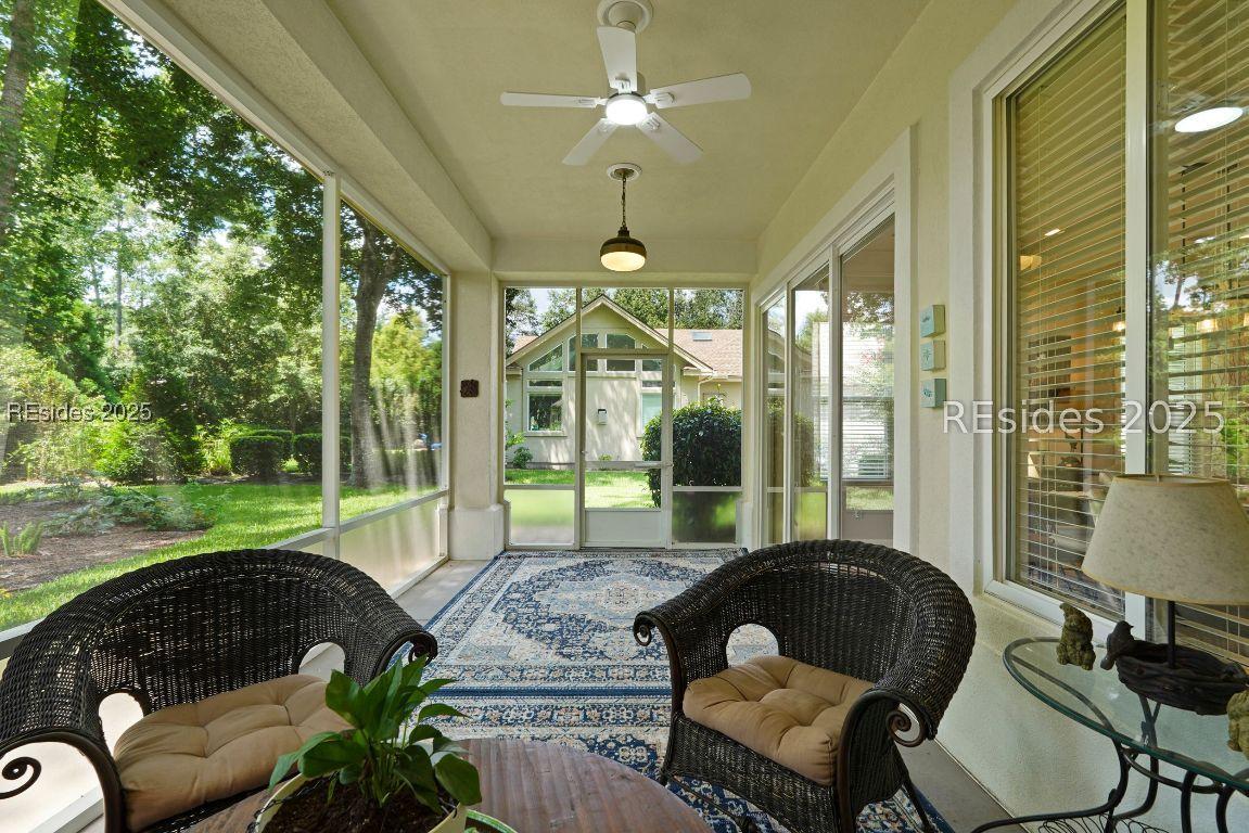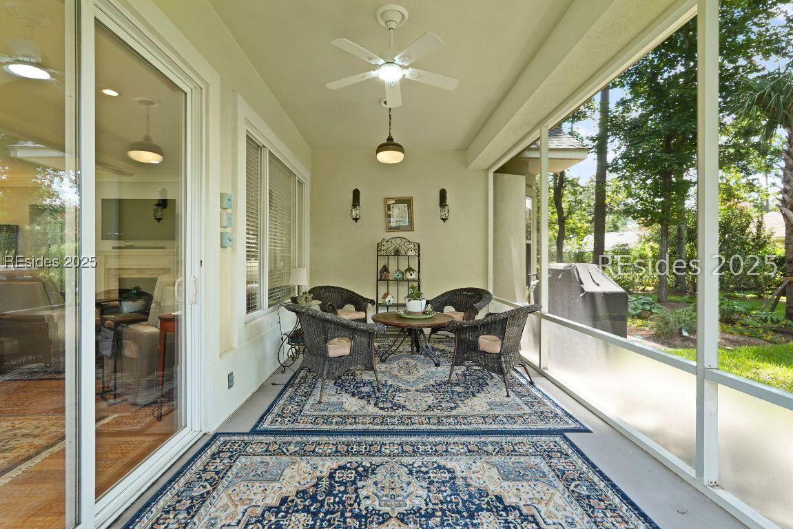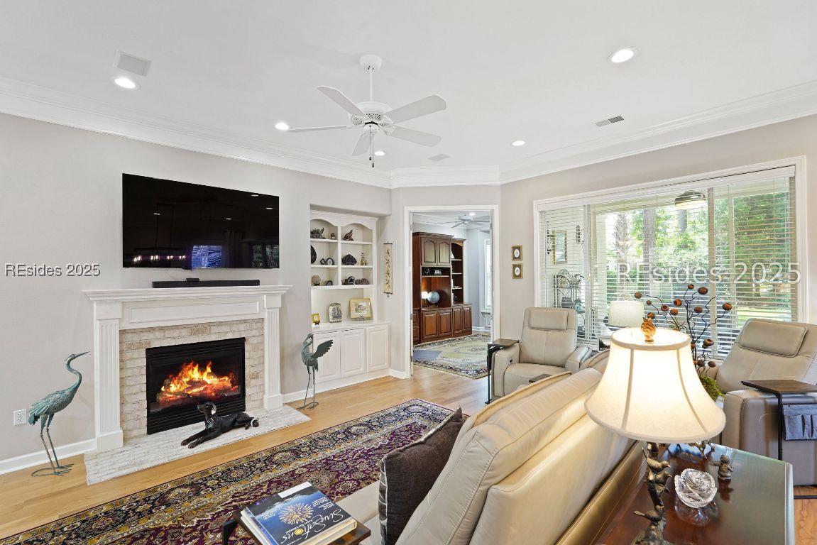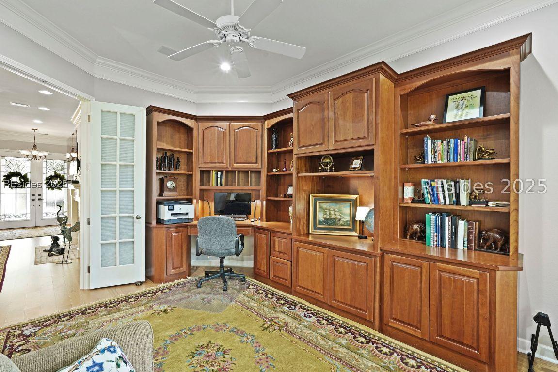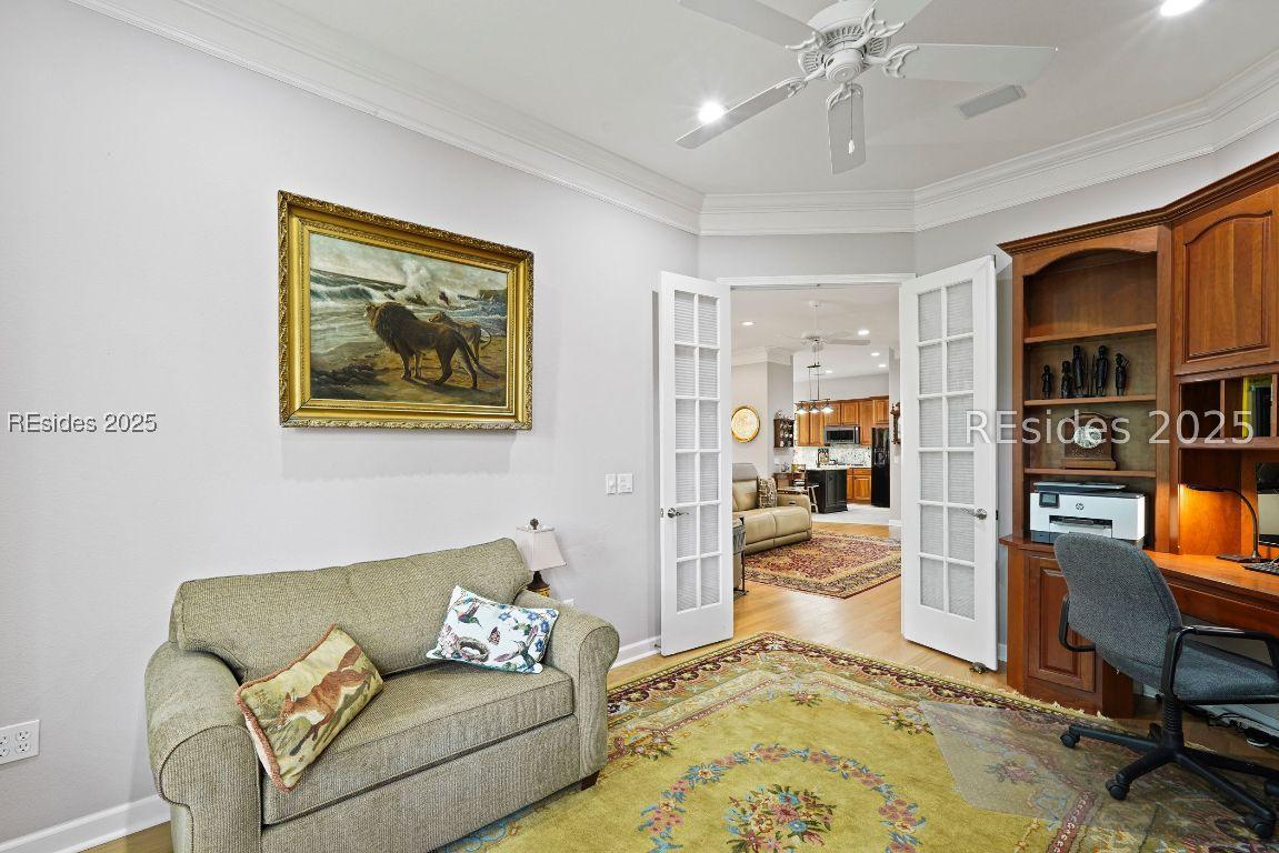 Beautiful 2 bed, 2 bath with an office that can be used as a 3rd bedroom! Lovely glass French door entry leads to an open floorplan with 10’ ceilings and huge kitchen. Great room has a gas fireplace with built-ins and crown moldings. Kitchen has lots of cabinets, granite countertops, large island with seating for 4, veggie sink. Walk-in panty and casual eating area completes the kitchen. Dining area overlooking the large screened in lanai. The office has built-ins and a bay window with storage in the seating area. Large primary bedroom suite with lovely views of the private backyard. The primary bathroom offers a dual sink vanity, separate shower, and soaking tub, plus a wonderful closet with built in organizers. Gorgeous and serene backyard with lovely landscaping, brick patio. New roof 2025, New custom shower in 2nd bath. New kitchen appliances, new ceiling fans, new recessed lights, new central vac, new garbage disposal, extensive fresh landscaping, Garage floor has new epoxy coating and garage LED lighting, 3 year old HVAC system. Two car garage with a golf cart bay!